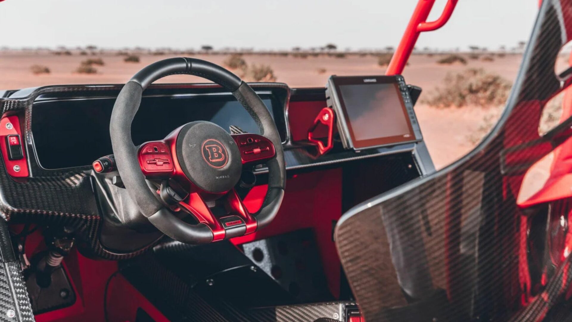 Quatre places, quatre baquets, et autant de raisons de perdre son déjeuner. Le tissu rouge « TechFX » vient tout droit du nautisme : c’est increvable et ça se lave au jet après une tempête de sable.