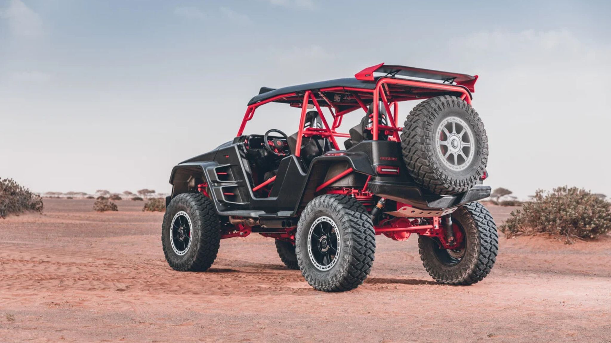 Le Brabus Crawler en plein saut dans les dunes du désert, buggy carbone de 900 ch basé sur le Mercedes Classe G sans portes ni vitres.