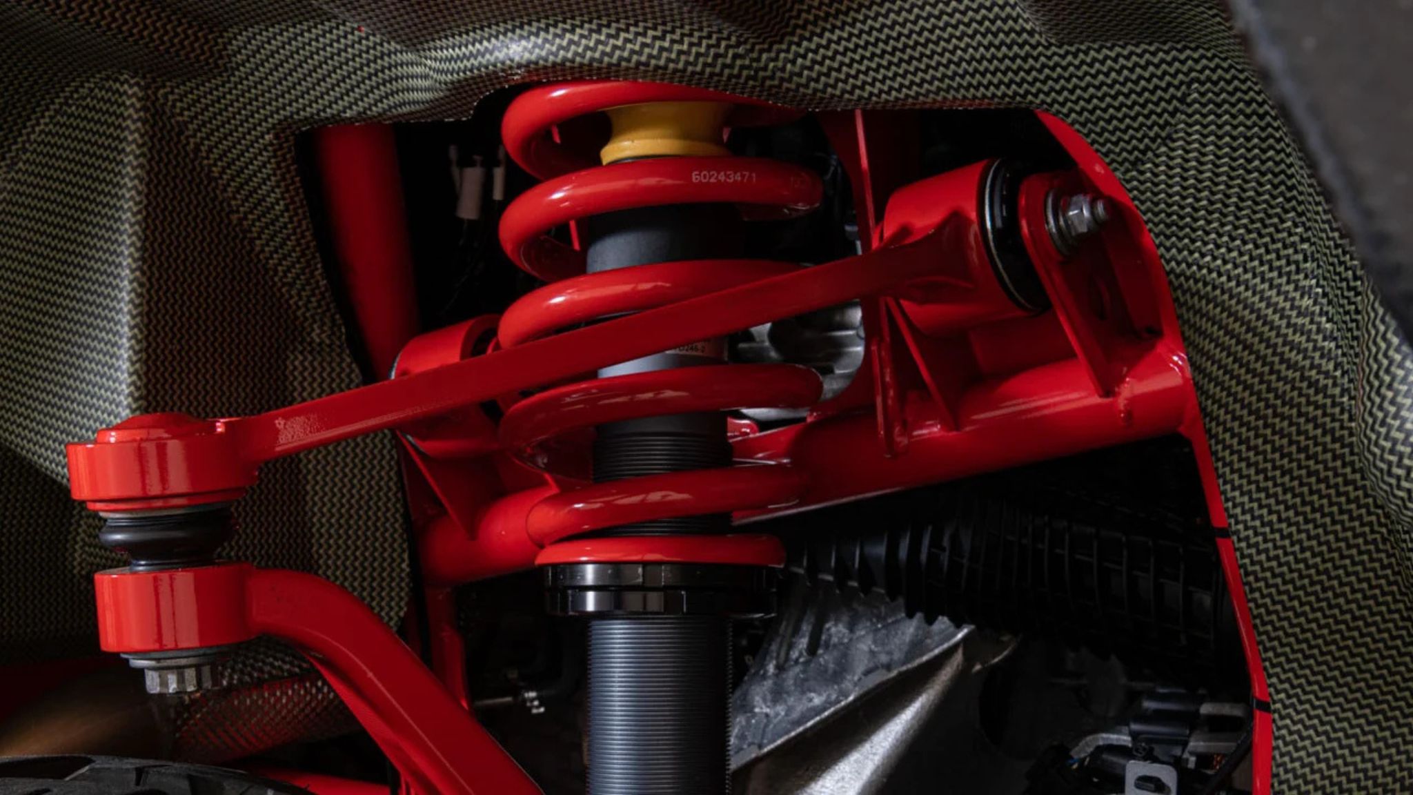 Pour se faire entendre au-dessus du V8 de 900 ch à 160 km/h sans pare-brise, mieux vaut utiliser le système d’intercom de ce casque en carbone livré de série. Et le harnais rouge n’est pas là pour la déco…