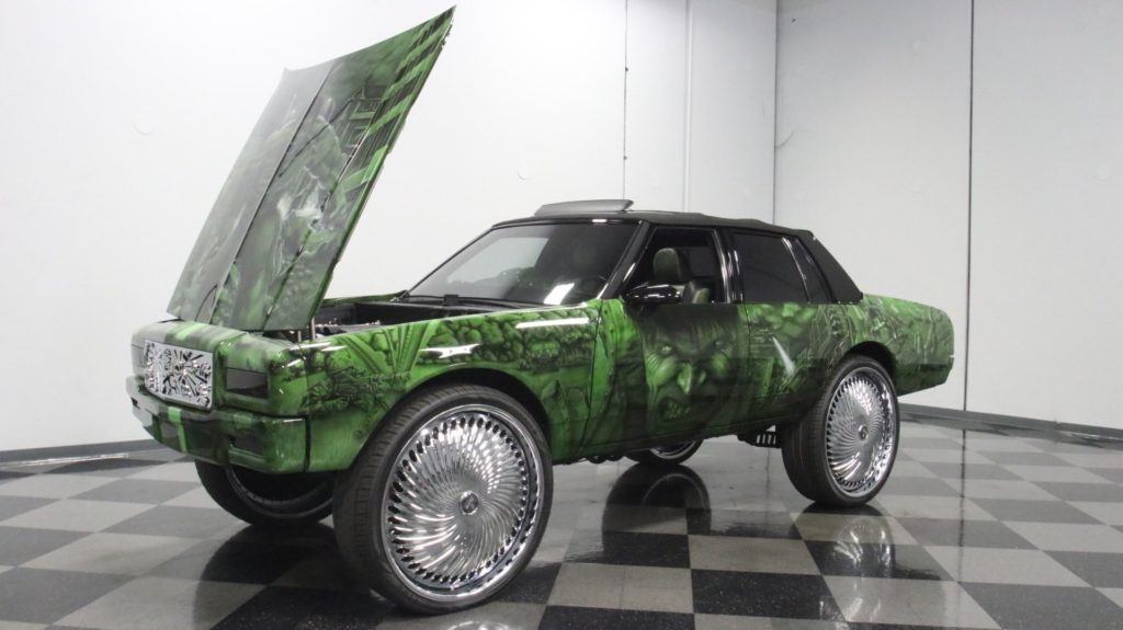 Comme on peut le constater sur les images, chaque millimètre carré de la voiture a été massacré transformé et personnalisé. A commencer par cette impressionnante aérographie rendant hommage au gros bohomme vert et costaud de l’univers Marvel. A en croire la description de l’annonce sur Streets ide Classics, cette peinture aurait coûté à elle-même près de 40000$, soit à peu de choses près le prix demandé pour la voiture. Toujours d’après l’annonce, on estime l’ampleur des travaux réalisés sur notre Caprice à plus de 200000$… Voilà qui fait une bonne affaire !