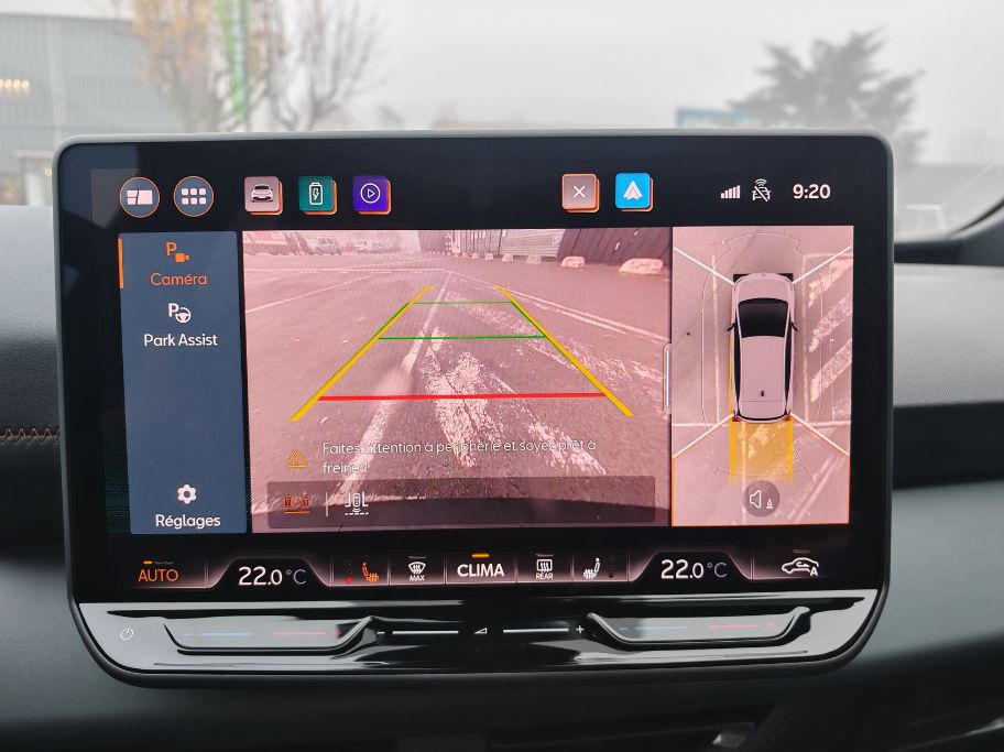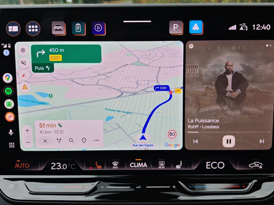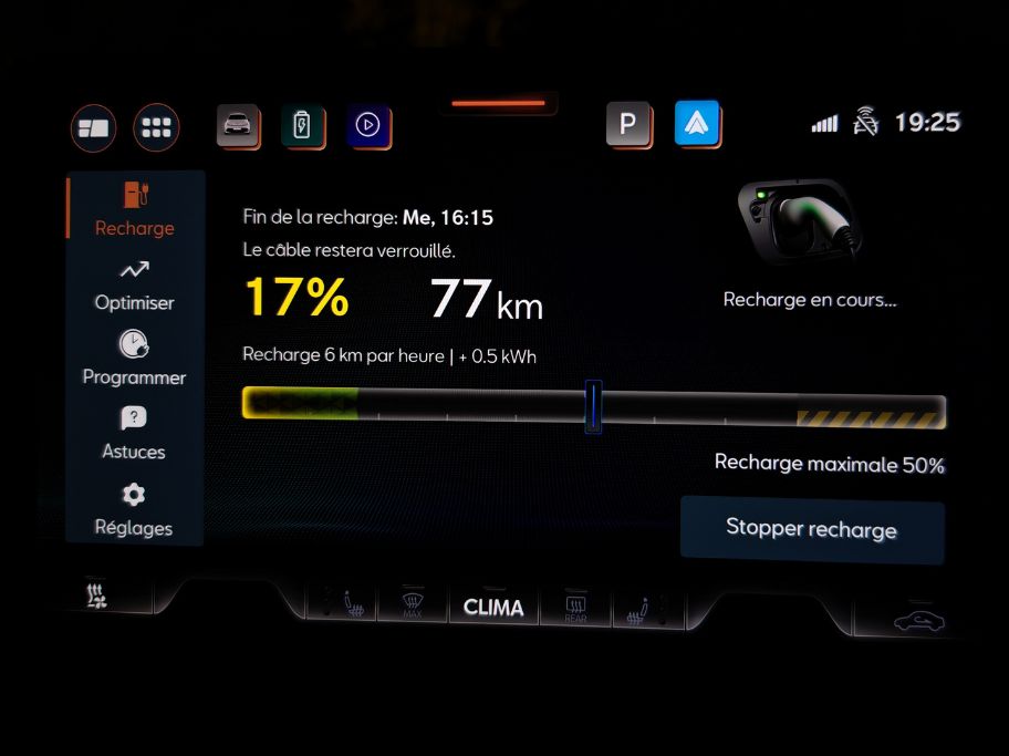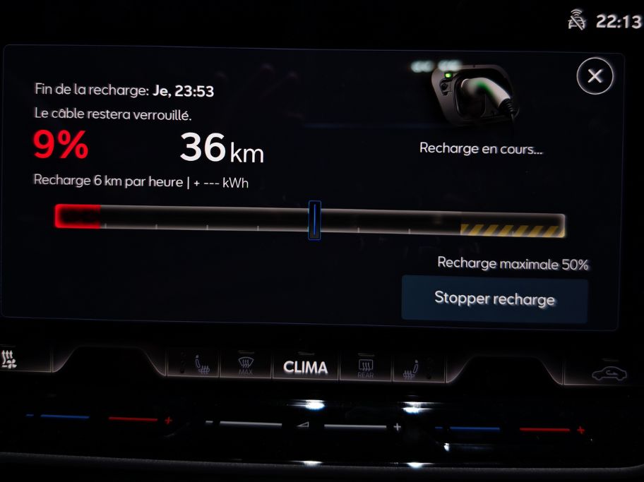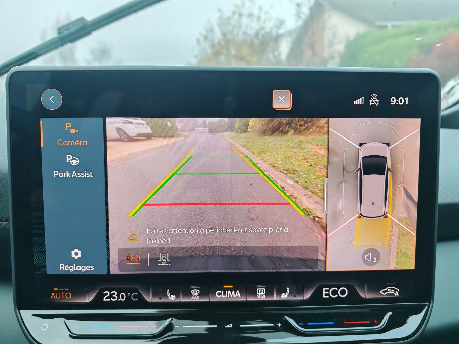 Autrement, que du classique dans l’habitacle avec notamment le grand écran de 12,9 pouces. Toujours aussi beau, toujours avec les mêmes coupures sur Android Auto sans fil, toujours avec une caméra 360 correcte et toujours avec une sono Sennheiser sans intérêt ; mais pour la première fois, buggé. Et buggé sur un truc indispensable : l’alerte de vitesse. Normalement, on a un raccourci en glissant vers le bas et on clique sur l’icône. Sauf que celle-ci disparaît régulièrement et qu’il faut la paramétrer de nouveau. Il semble que ce soit un défaut de longue date, sans correction à ce jour. On a aussi des bizarreries sur la climatisation bien que son efficacité ne puisse être remise en question grâce à une pompe à chaleur (option à 1 050 €).
