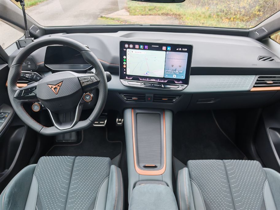 La Cupra Born VZ peut s’imposer dans la catégorie des GT compactes avec une puissance notable et surtout le couple instantané des 100 % électriques. Le confort règne entre les suspensions adaptatives, les sièges baquets et le silence dans l’habitacle. On regrette toutefois des errements ergonomiques avec les touches haptiques sur le volant et surtout des bugs de raccourcis et de climatisation dans l’écran. Pas la peine d’imaginer une conduite sportive avec un comportement trop neutre/correctif ainsi qu’une pédale de frein mouvante. D’autant plus que les consommations s’envolent déjà suffisamment par temps froid.
