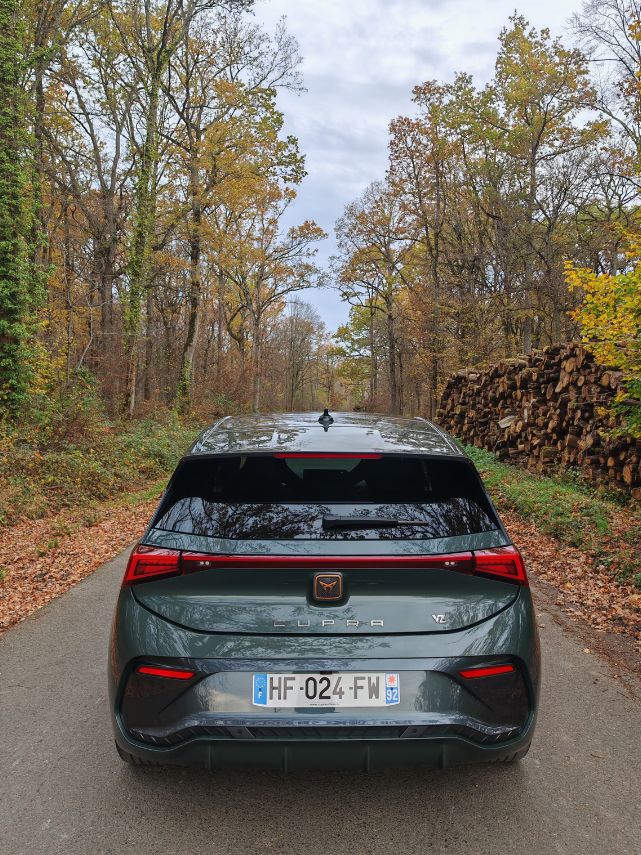 J’allais continuer avec la bonne motricité grâce à la transmission vers les 4 roues mais la chaussée humide m’a fait changer d’avis avec un louvoiement sévère de l’auto. Et cela à plusieurs reprises. Le manque de grip des Bridgestone Potenza Sport déçoit. Donc on revient à la base. La Cupra Born VZ est une compacte à vocation GT pour ses performances. Car effectivement, les critiques négatives semblent nombreuses de prime abord mais majoritairement, j’ai apprécié le couple immédiat et la puissance développée. On parle de 545 Nm et surtout d’un 0 à 100 km/h en 5,6 secondes. Il devient évidemment facile de doubler et encore plus de s’insérer sur les voies rapides. Le tout en silence, pas toujours si évident en 100 % électrique. On regrette quelques bruits de mobilier (très aléatoires et donc pas si fréquents) et c’est tout.