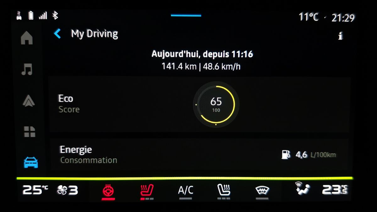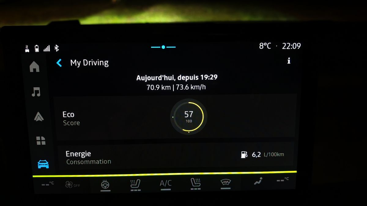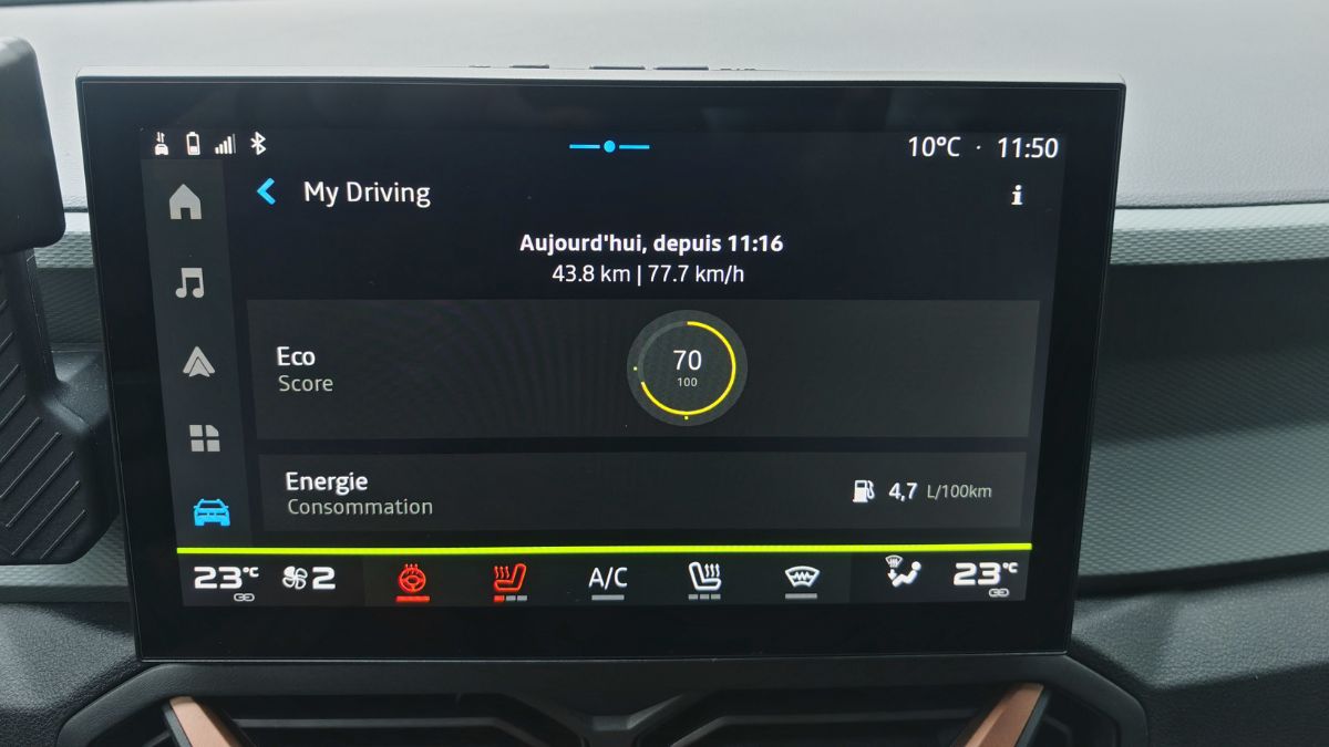 Dès lors, il faut clairement adopter une conduite apaisée pour ne pas brusquer la mécanique. Les consommations vous remercieront, bien qu’elles soient minimes quel que soit l’usage. Une nouvelle réussite pour Renault/Dacia avec une moyenne à 5,2 l/100 km après 480 km avec des trajets mixtes comprenant toutes les situations : bouchons, ville, réseau secondaire et autoroute. Le panel s’étend de 4,6 l/100 km à 6,2 l/100 km sans jamais d’écoconduite. Un résultat similaire au Lexus LBX, plus petit et moins puissant. Avec 50 litres de réservoir, on dépasse les 900 km d’autonomie.
