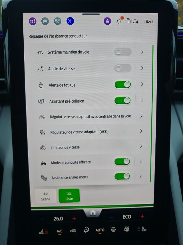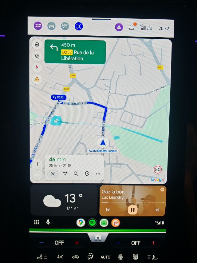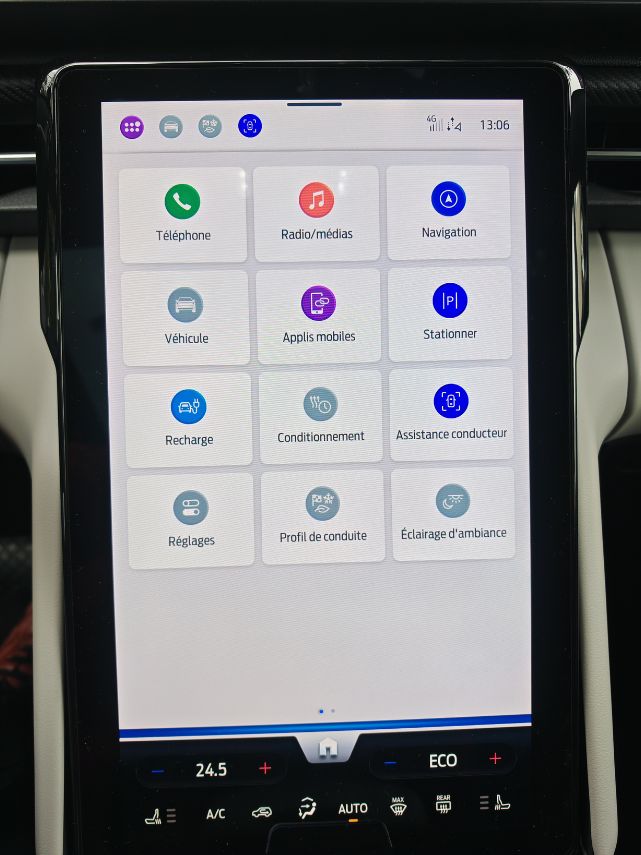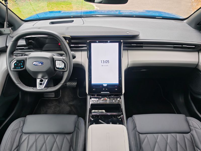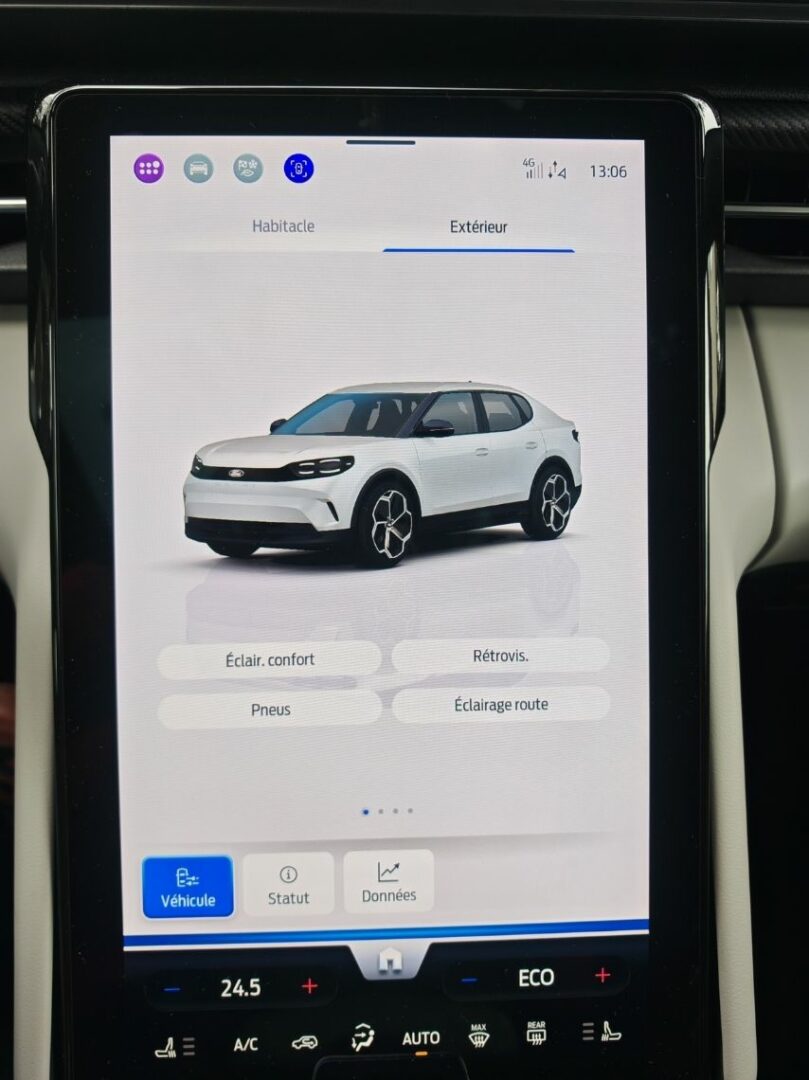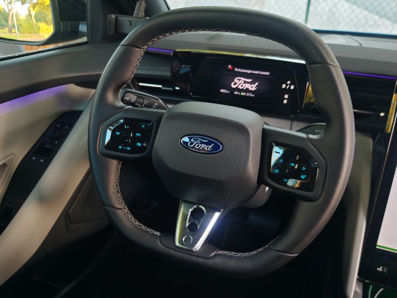 Dès qu’on s’installe, on remarque la grosse dalle, façon Tesla mais dans l’autre sens. Le Mustang Mach-E avait déjà initié cet équipement. Cette fois-ci, on peut le basculer en l’inclinant à souhait. Totalement fermé, il offre la possibilité d’un coffre-Ford. Jeu de mots. On regrette les nombreuses coupures audio avec Android Auto sans fil et les quelques déconnexions totales inexpliquées. Les menus et sous-menus sont nombreux et parfois peu intuitifs mais on arrive au final à s’y retrouver. Sauf pour couper la climatisation. Je m’y perds. Heureusement, pour les alertes à la con, comme notamment celle de la vitesse, un raccourci permet de toutes les couper en deux clics.