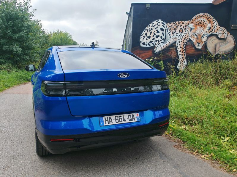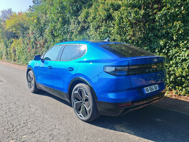 En hommage au coupé Ford des années 70 et 80, le nouveau Capri reprend une transmission propulsion. Il reprend surtout la base technique (plateforme MEB) de la Volkswagen ID.5 qui actionne les roues arrière dans cette version 286 ch. C’est la puissance idéale à mon sens pour ce type de motorisation comme pour la BMW i4, le Smart #3 ou le Model Y de Tesla. Aucun problème de motricité et même un léger tempérament joueur avec un train arrière mobile et un train avant facile à placer. D’autant plus que le roulis se contient avec ce châssis pertinent.
