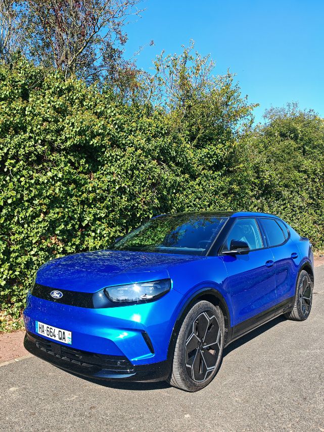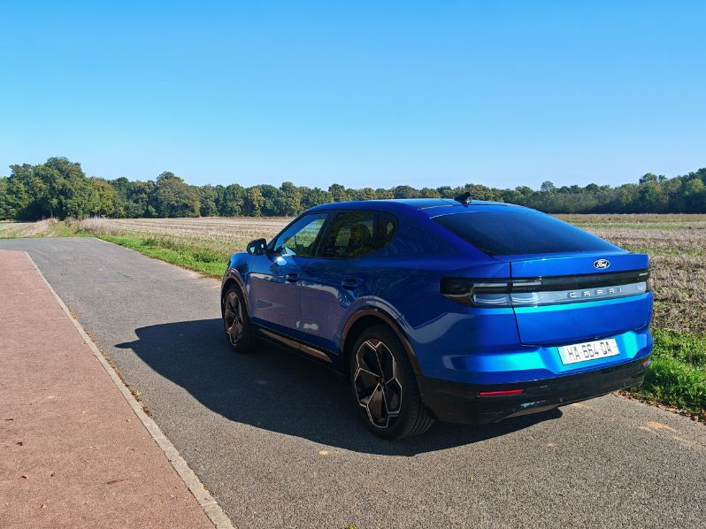 À l’instar de l’ID.5, le Capri est moche. Moins moche en vrai qu’en photo mais moche quand même. Pourtant, étant jeune, j’adorais le BMW X6, premier SUV coupé. Pour ce Ford, ça manque totalement de personnalité et on ne reconnaît pas le design américain, qui n’est pas américain. C’est au siège européen, à Cologne, que tout s’est dessiné. Même la jolie couleur Blue My Mind (option à 900 €) n’arrive pas à limiter les dégâts. Encore moins les trop grosses jantes hideuses de 21 pouces (option à 600 €). En parlant de poids, on dépasse les 2 tonnes et on le ressent au volant. Particulièrement sur les freinages, même sans trop de vitesse. L’inertie est énorme. C’est clairement un défaut habituel dans ce segment, comme chez l’Ariya.