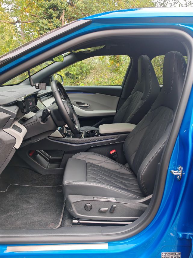 Au niveau de l’habitacle, on apprécie grandement la qualité d’assemblage sans le moindre bruit de mobilier. Certains plastiques s’avèrent trop durs pour le prix de cette finition Pack Premium à 58 950 € avec toutes les options (soit 2 000 € de moins que le cousin germanique) dont le grand toit panoramique trop occultant (comme sur le Model Y Performance) et la pompe à chaleur. L’instrumentation numérique de 5,3 pouces et l’affichage tête-haute offrent la lisibilité attendue.