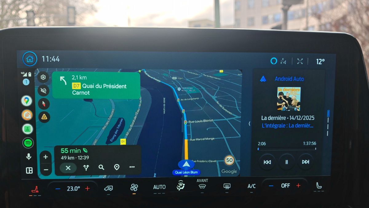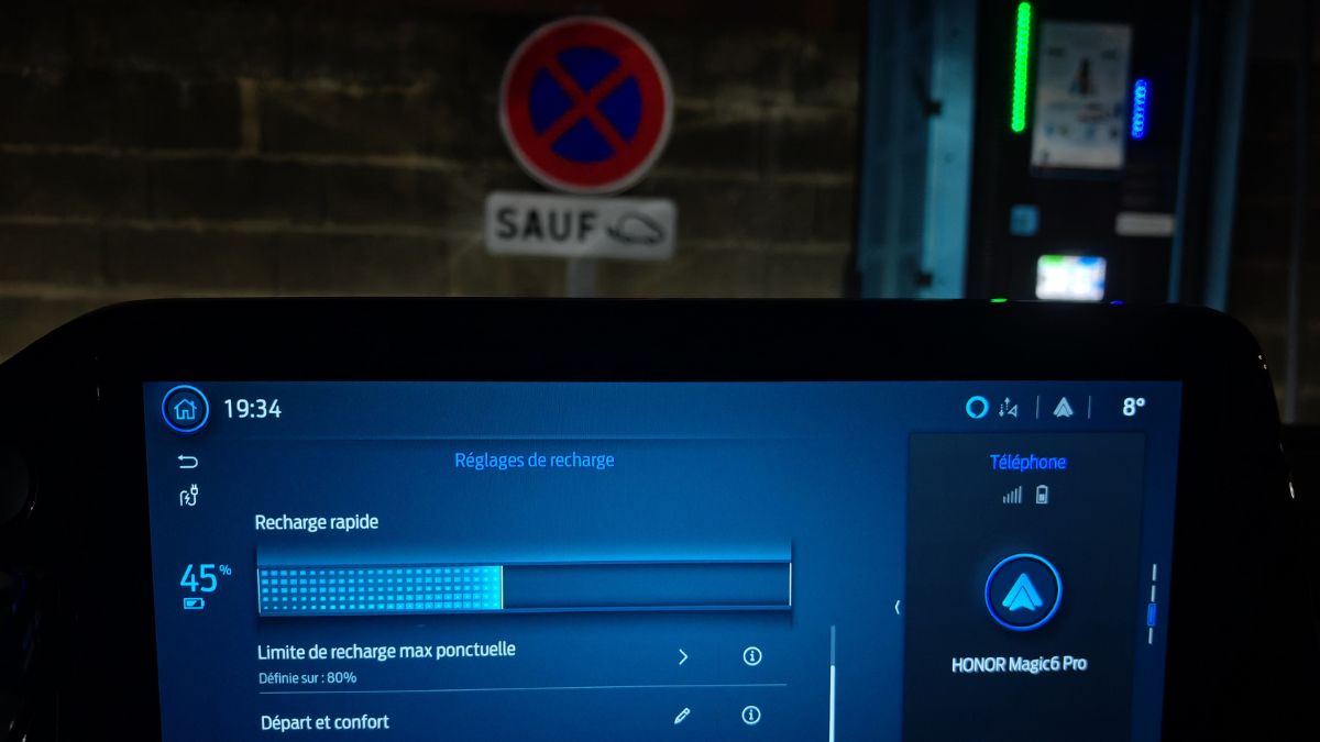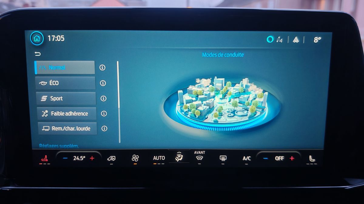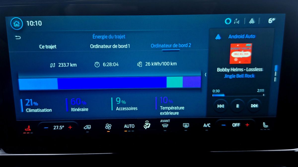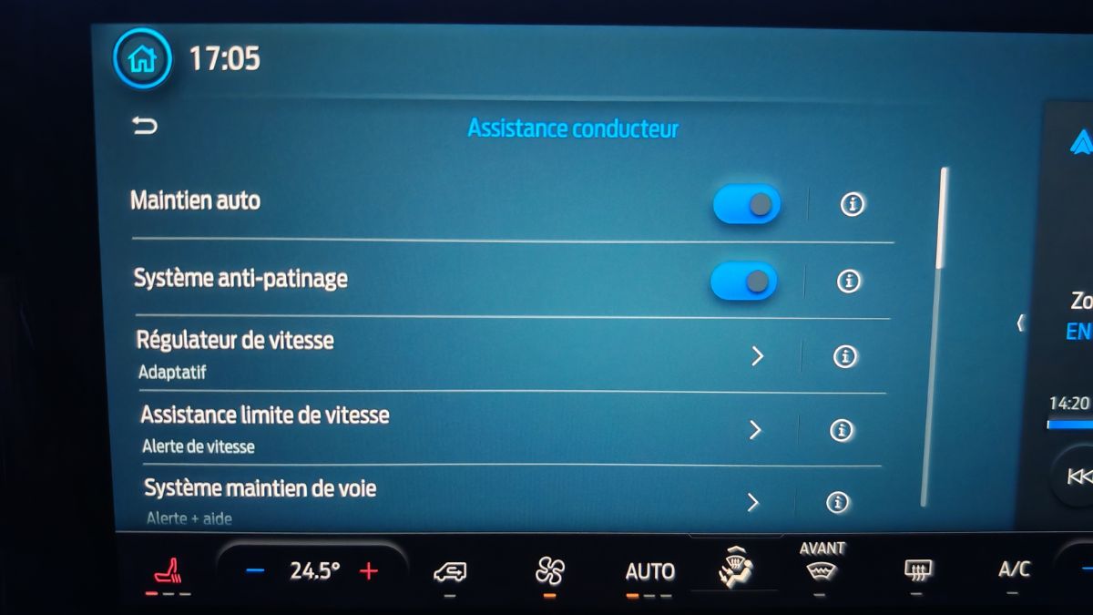 L’écran de 13 pouces propose une taille appréciable avec des menus relativement ergonomiques sauf pour couper l’alerte de vitesse. Heureusement qu’on peut le faire en une seconde avec un appui long sur une touche du volant. Les compteurs donnent beaucoup d’informations et on peut les paramétrer/limiter. Le régulateur de vitesse adaptatif fonctionne correctement. Le système audio dépasse le niveau moyen. On note des coupures de son régulières avec Android Auto sans fil et pas de bouton mute sur le volant. Celui-ci n’est malheureusement pas chauffant de série contrairement aux sièges brûlants.