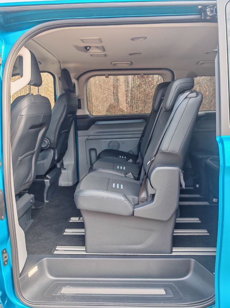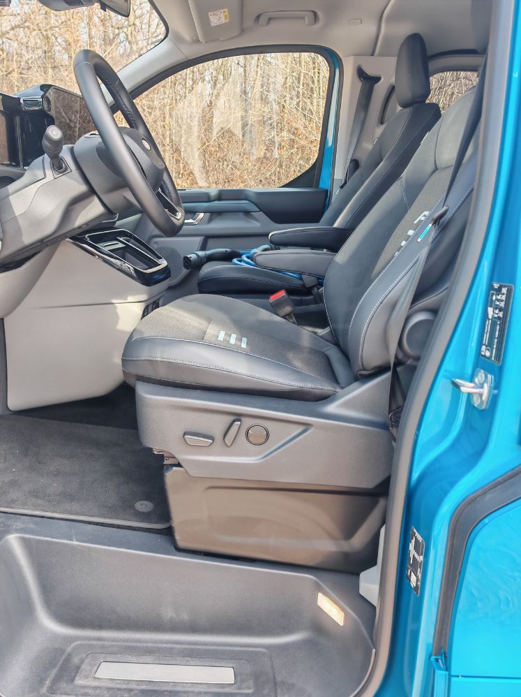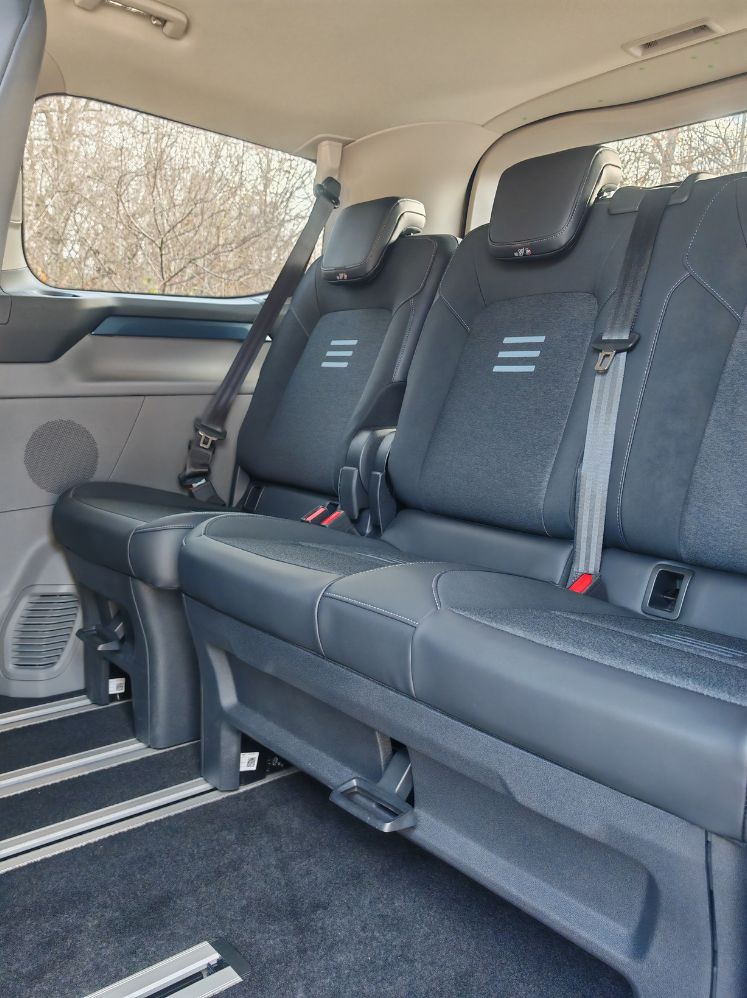 Tout l’intérêt de ce Ford E-Tourneo Custom réside dans son habitabilité folle. Notamment à l’avant avec un espace royal pour les occupants. Forcément, pas de banquette donc on peut poser son sac (ou même son câble de recharge) au sol. À l’arrière, les dossiers s’inclinent et la climatisation se règle au plafond avec aussi des veilleuses sur les côtés. Les sièges coulissent sur des rails et avec une tirette, on peut les plier pour accéder encore plus facilement au dernier rang. Attention toutefois aux passagers qui vont se retrouver sur l’essieu donc bien moins lotis que les autres voyageurs.