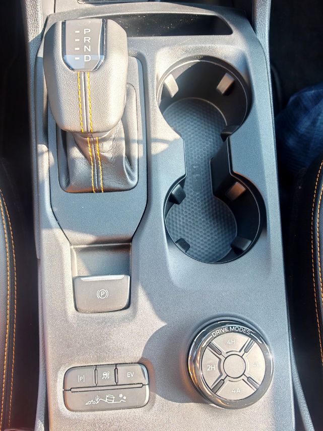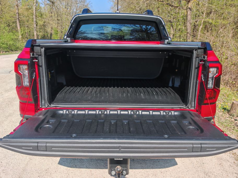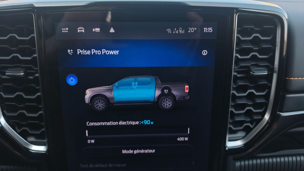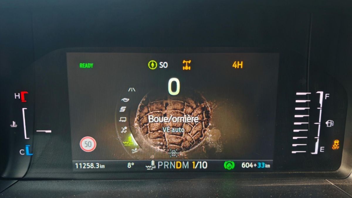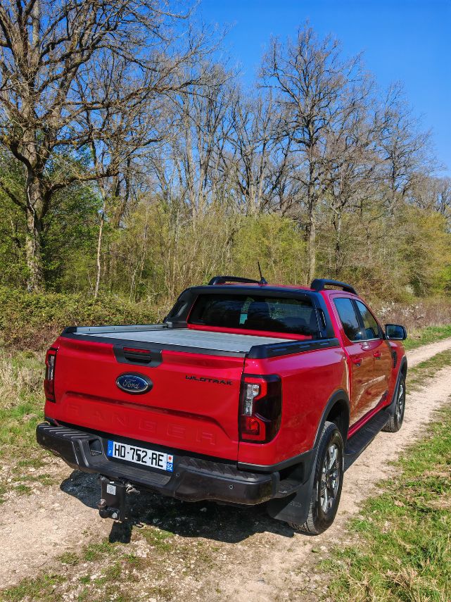 Le Ford Ranger PHEV sort 697 Nm de couple donc idéal pour tracter et cela jusqu’à 3 500 kg ! On peut aussi foutre 993 kg de charge utile ou des plantes pour son jardin. Le rideau motorisé de la benne amène de la tranquillité tout comme les prises jusqu’à 6,9 kW/15 A pour des outils électriques de chantier (ou une télé). On en trouve aussi dans la cabine avec l’option Prise Pro Power. Rien ne manque pour les modes de conduite avec Normal, Eco, Sport, Glissant, Remorquage/Traction, Boue/Ornières et Sable. On complète les informations avec les transmissions propulsion (2H) ou intégrale 4H (classique), 4L (courte) et 4A (auto). Son châssis encaisse les virages rapides et le roulis apparaît rarement.