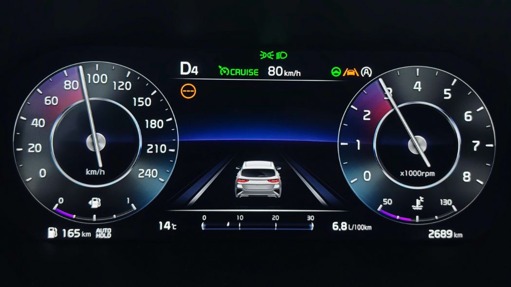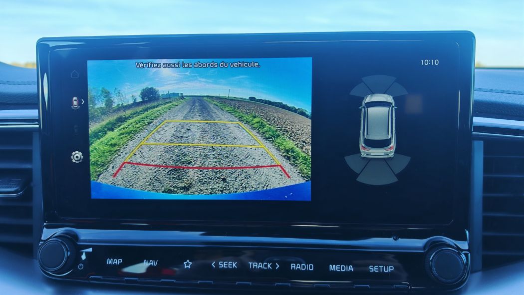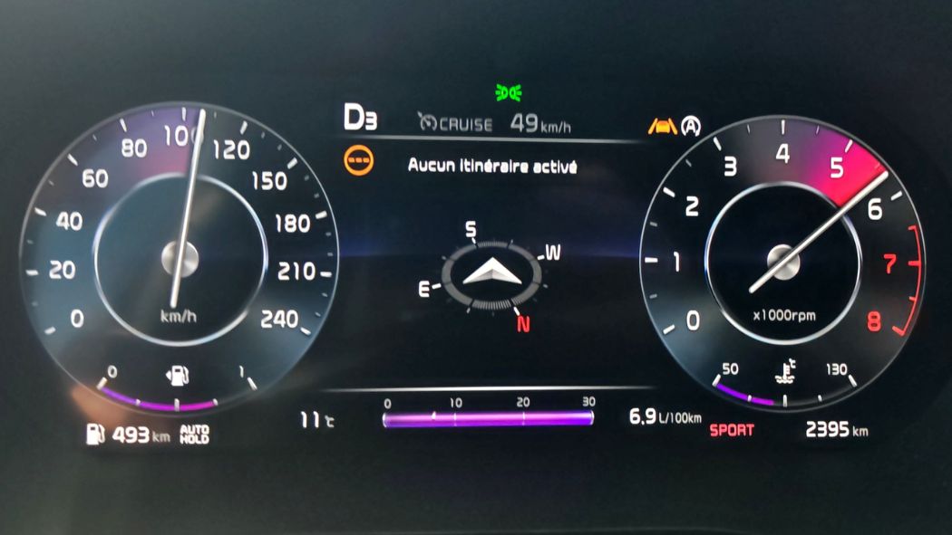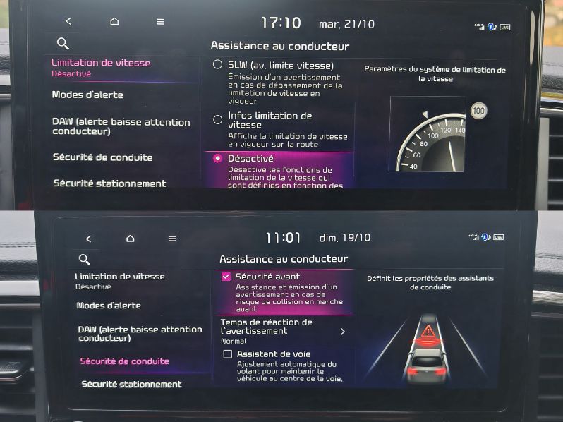 Je ne ferai pas de copier-coller cette fois-ci. Nonobstant, je vais encore raconter la même chose. Hyundai/Kia disposent des pires bips et aides à la conduite du marché. On n’a même pas commencé à rouler que ça sonne. Heureusement, pas de signal au démarrage comme sur l’i30. Sauf que l’alerte de vitesse se déclenche immédiatement et on met 15 plombes à la désactiver. Malgré un bouton raccourci sur le volant, le temps d’affichage du menu idoine est indigne. Outre la latence, la sensibilité tactile est aussi mauvaise. Je perds donc rapidement patience pour couper cette merde. Idem pour l’alerte collision qu’on doit enlever uniquement à l’arrêt. Autrement, on se la prend à chaque ralentissement ou même au redémarrage avec une voiture devant. Pour le franchissement de ligne, c’est sur le volant ou aussi sur le côté, avec un appui de 3 secondes. C’est long. Sachant qu’on doit réaliser l’ensemble de ces manipulations si on veut rouler sereinement.