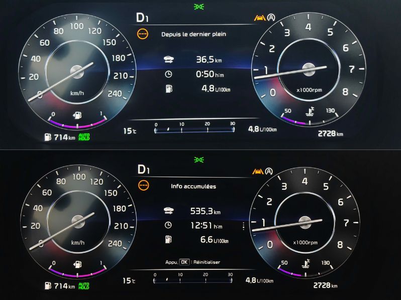 Une nouvelle fois, c’est l’histoire du verre à moitié vide ou à moitié plein. Sur la Hyundai, les consommations m’ont déçu avec un résultat à 7,1 l/100 km sachant que je n’avais jamais tiré dedans. Elle manquait sûrement de rodage (avec 7 km au compteur). Pour la Kia, en m’amusant souvent pied au plancher, j’ai une moyenne de 6,6 l/100 km après 535 bornes. Donc un résultat correct pour des essences de cette puissance. Il aura manqué des trajets autoroutiers car sur des routes fluides à 70 ou 80 (des conditions idéales), la consommation s’effondre même à 4,8 l/100 km. Grâce au réservoir de 50 litres, on dépasse les 740 km d’autonomie. Un bon chiffre dans cette catégorie.