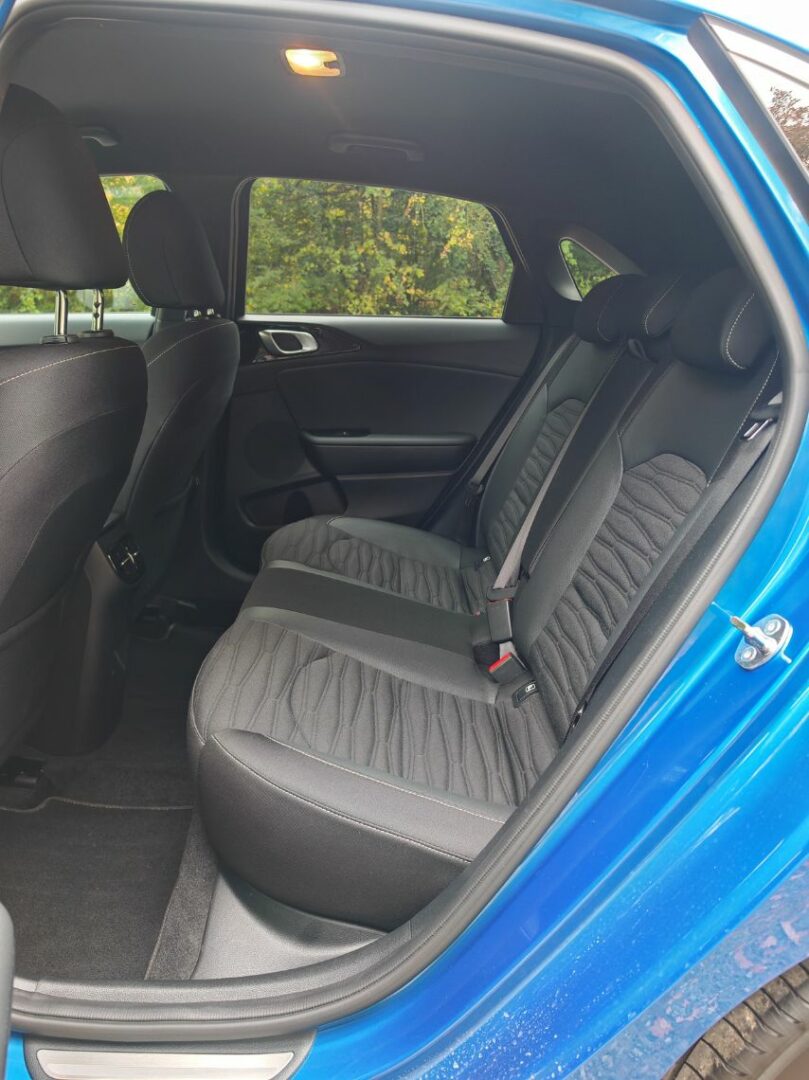 On termine cet article sur le physique de la compacte asiatique. De profil, elle ressemble aux nombreuses concurrentes sur le marché comme évidemment l’i30 mais aussi Focus, 308, Golf et surtout Série 1. Sauf que c’est la BMW qui a copié son design. Kia parvient à se différencier avec le dessin en nid d’abeilles pour les feux de la poupe. Son Bleu Fusion lui donne un éclat permanent, même par mauvais temps. Les jantes de 17 pouces en étoile alourdissent l’ensemble, un peu décevantes.