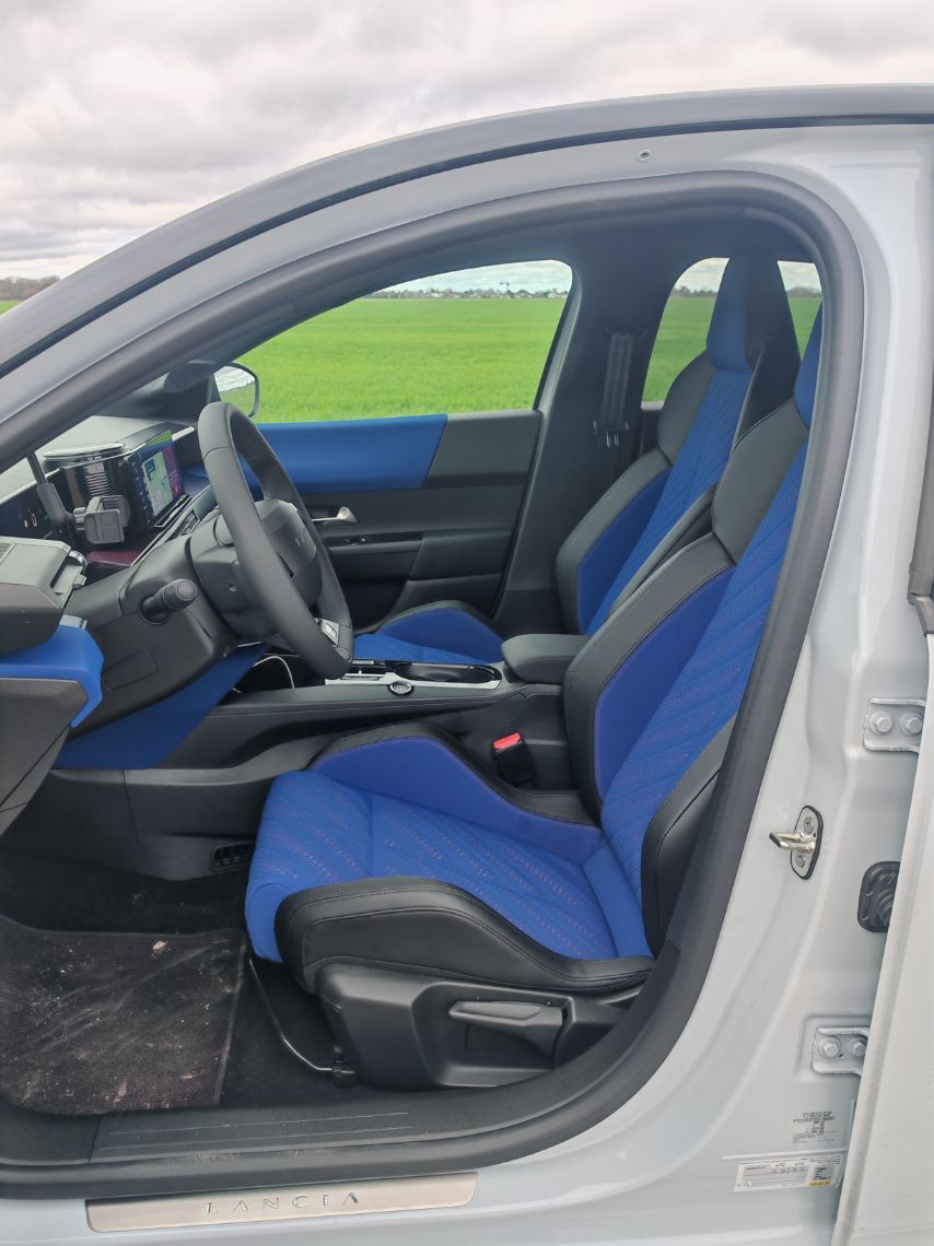 J’aurais pu ou dû commencer par ce point. L’habitacle coloré de la Lancia Ypsilon HF avec des sièges bleus et du violet pour les tapis de sol et une partie du tableau de bord (en complément du bleu sur les portières). Un plaisir fou de voir ceci en 2026 car les intérieurs sont majoritairement sombres et tristes. On retrouve l’originalité d’une Renault 5. Les plus médisants parleront de sièges vieillots rappelant ceux des métros RATP. Moi j’y vois de la gaîté surtout qu’ils sont confortables et moelleux. Aucun bruit de mobilier à signaler.