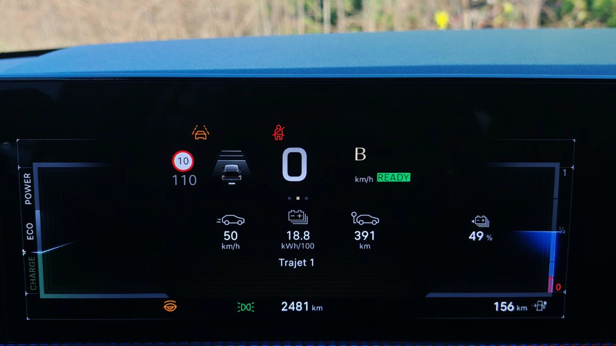C’est vraiment comme si la partie électrique était totalement bâclée. J’ai du mal à le pardonner. Le coup de grâce arrive avec un affichage de l’autonomie en WLTP (370 km si montée avec ces très bons Michelin Primacy 4 S1) et non en réalité. Exactement comme sur l’EX30 Cross Country sauf que je n’ai pas trouvé le bouton pour basculer sur le chiffre réel. Encore un exemple incompréhensible après une trentaine d’électriques testées.