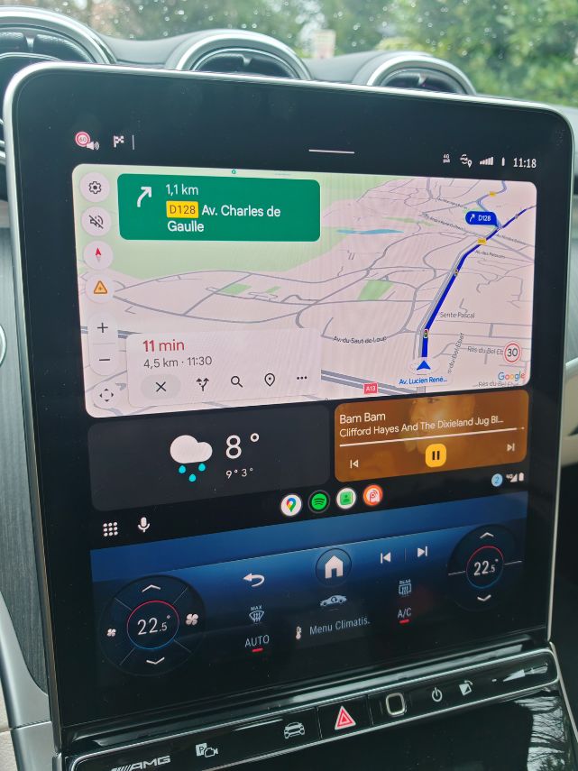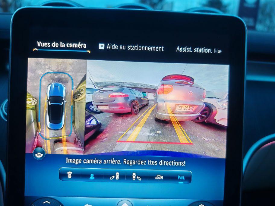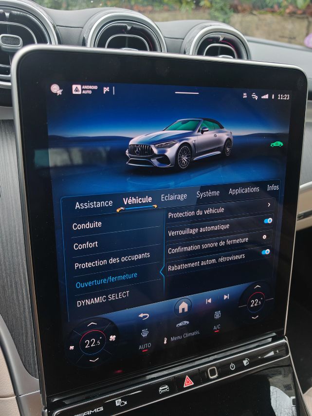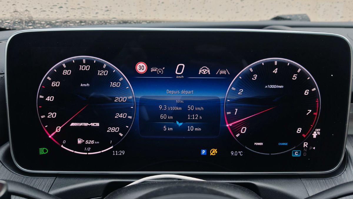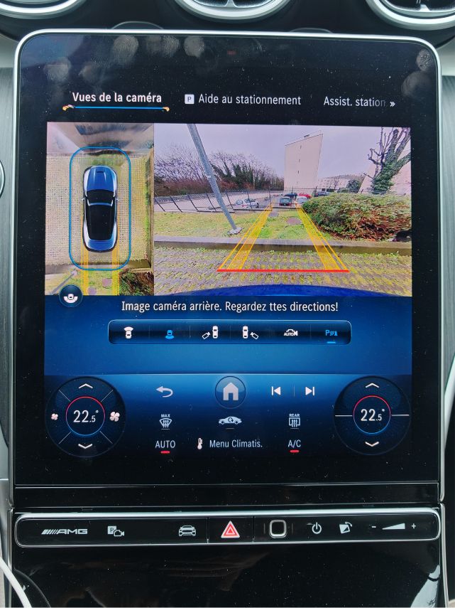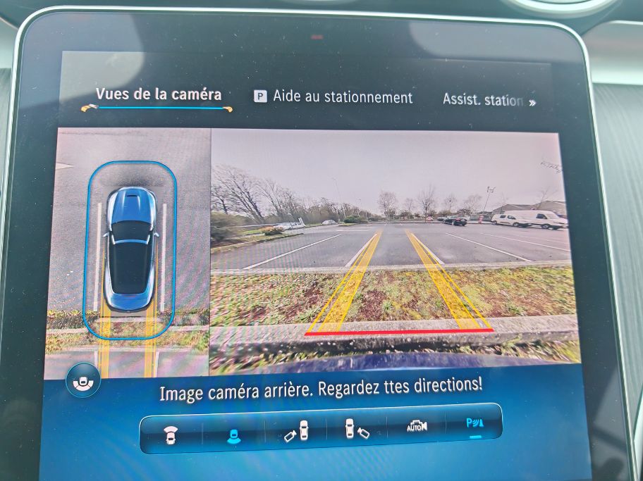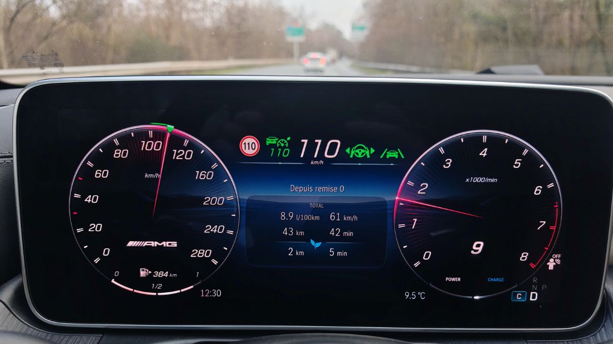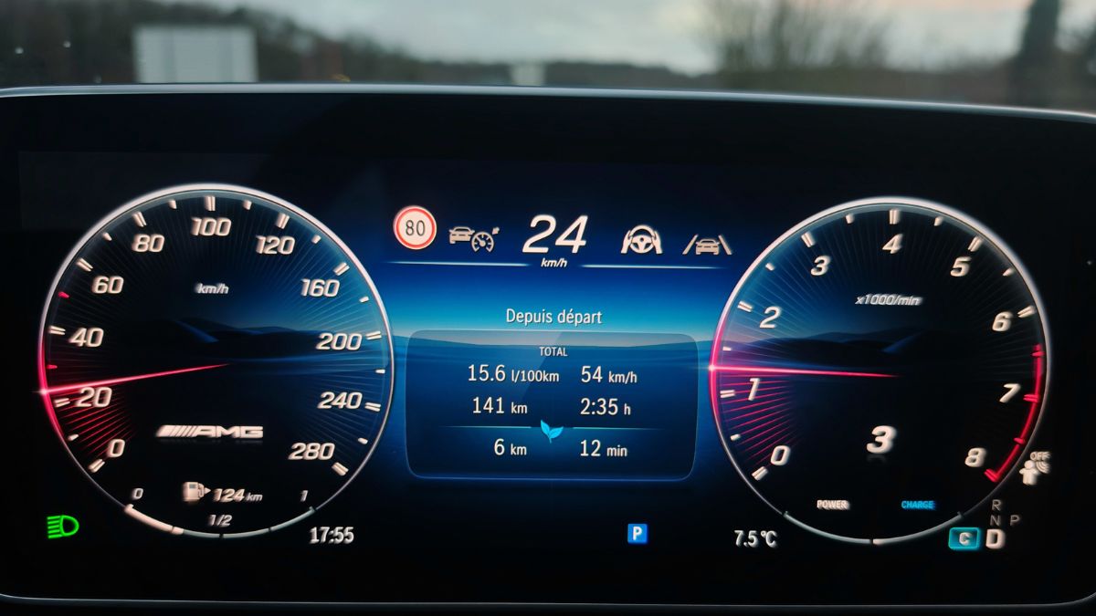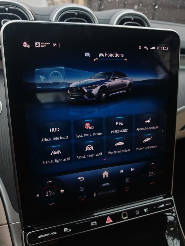 Dès la moindre vibration, le frottement engendre des grincements comme sur cette vidéo. J’ai dû basculer l’écran central vers l’avant (normalement pour éviter les reflets solaires) afin de limiter les désagréments phoniques. Mais bon, quand je vois que c’est pareil dans une Classe S, Mercedes doit absolument tout rebâtir car c’est gentil les lumières partout pour des vidéos TikTok tape-à-l’œil (essai réalisé avec une conjonctivite, je déconseille) mais ça grève énormément l’agrément. Tout comme ce volant avec des boutons physiques (dont le mute) et tactiles toujours aussi non ergonomiques. Heureusement, les différents menus sont accessibles aisément sur l’écran vertical de 11,9 pouces dont les réglages de climatisation. Un simple clic pour couper l’alerte de vitesse.