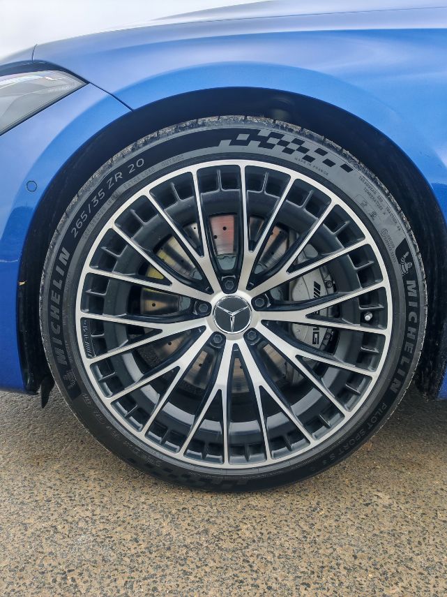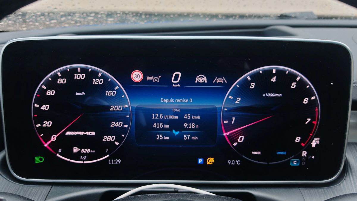 Comme c’est une AMG, je m’attendais à des suspensions plus fermes. Voire trop fermes. Finalement, c’est le bon compromis avec un réglage adapté en fonction du type de conduite. Attention aux éblouissantes jantes à branches en Y de 20 pouces qui font ressentir les aspérités de la chaussée et aussi s’entendre sur voie rapide. Cela reste tolérable surtout par rapport aux prestations du châssis. Quand on voit le morceau de 4,85 m et surtout de 2 110 kg, on peut s’attendre au pire. Le châssis tient la route, même en mode Sport +, bien que je n’aie pas poussé les limites à finir dans un fossé. On apprécie la monte en Pilot Sport S 5 avec la sécurité traditionnelle des Michelin sur le mouillé et surtout la motricité irréprochable grâce à la transmission (intégrale) 4Matic+. L’accroche des freins se fait immédiatement avec une course de pédale très courte.