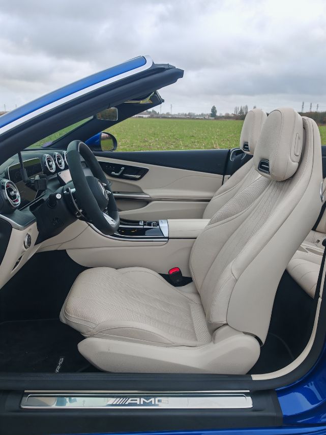 Le confort des sièges (en cuir beige macchiato/noir à 2 000 €) est remarquable, ce qui n’est pas toujours le cas chez Mercedes. Ils sont bien chauffants contrairement au volant où il faut rajouter 450 € au 111 750 € pour pouvoir en bénéficier. J’ai toujours du mal avec ces mesquineries quand cet équipement est majoritairement disponible sur des voitures à 40 000 €. On pourra se réchauffer les mains en s’agitant grâce à la sono Burmester. Habituellement, je la trouve bien mais en deçà d’une Bang et Olufsen. Toutefois, je ne sais pas si c’est le kiff de rouler décapoté mais j’ai adoré monter le son (malgré de nombreuses coupures sur Android Auto sans fil) et profiter de ce luxe si rare en 2026.