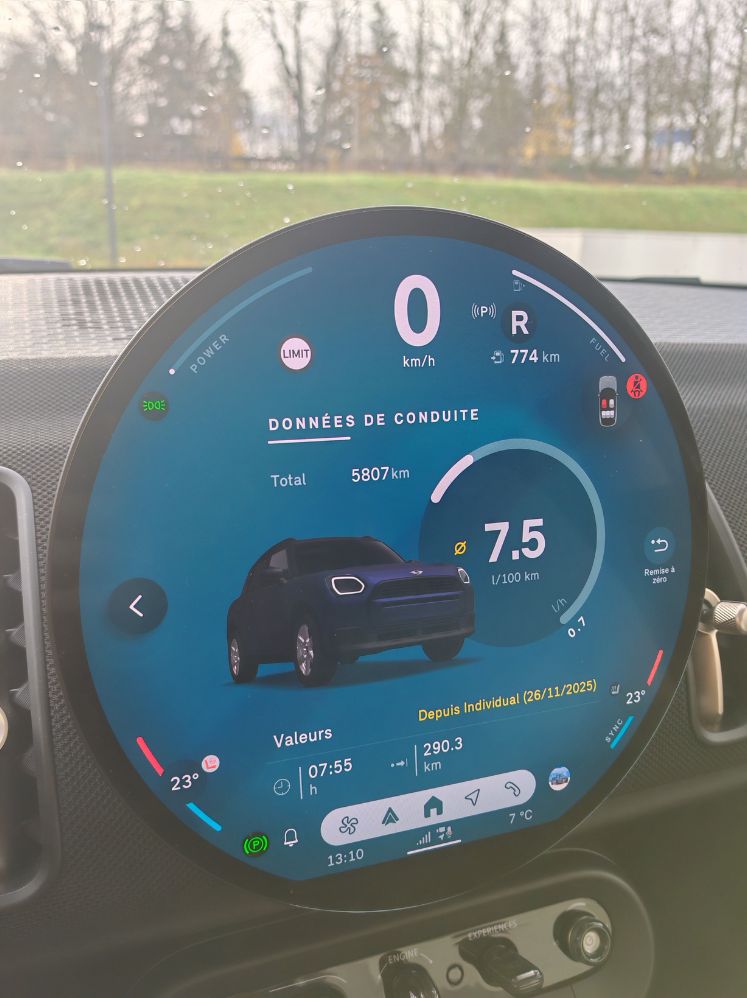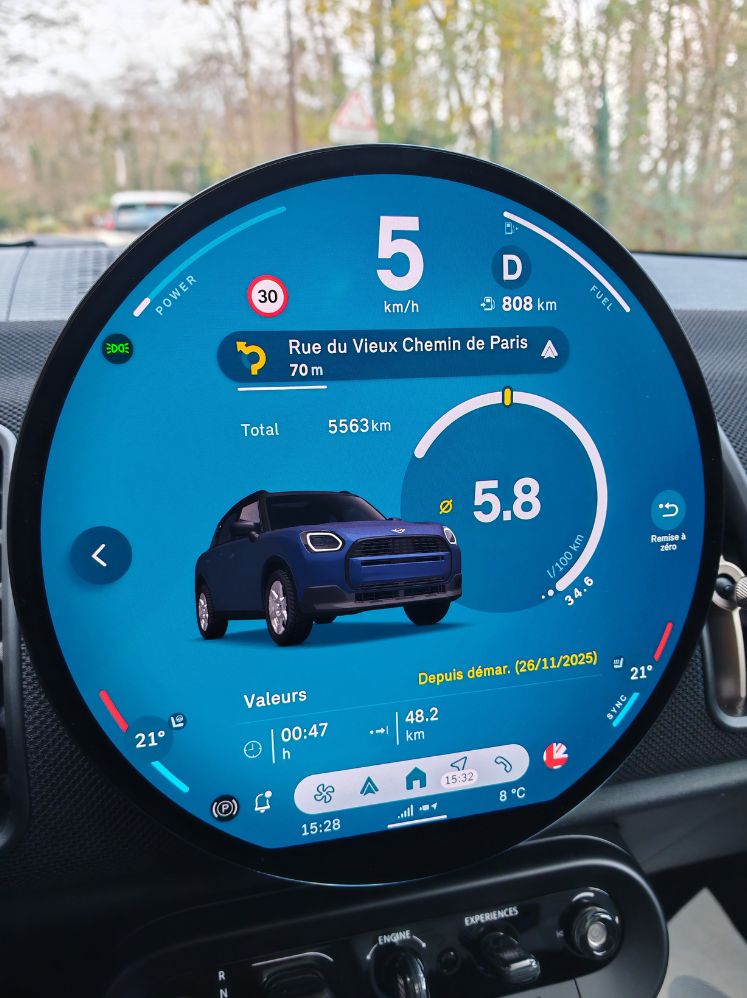 Durant ma semaine d’essai, j’ai multiplié les courts trajets urbains. Aucun problème en soi sauf pour la consommation. Dès lors, je termine à 7,5 l/100 km de moyenne après 290 bornes donc c’est un peu trop élevé à mon goût mais c’est vraiment à mettre en perspective par l’usage. Surtout quand le Mini Countryman C affiche un très beau 5,8 l/100 km sur un parcours fluide. Avec 54 litres de réservoir, on dépasse les 800 km d’autonomie.