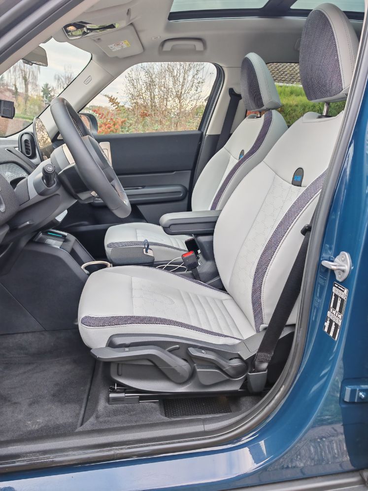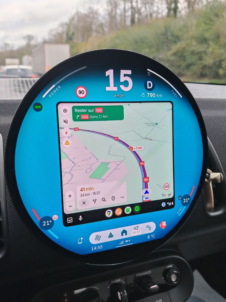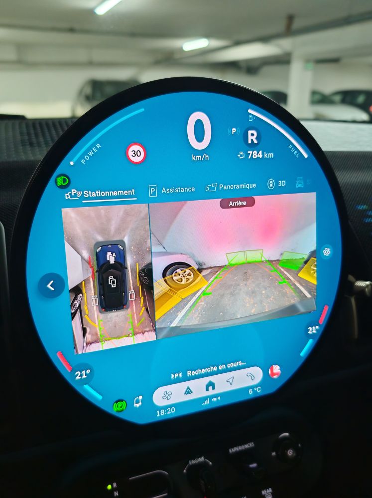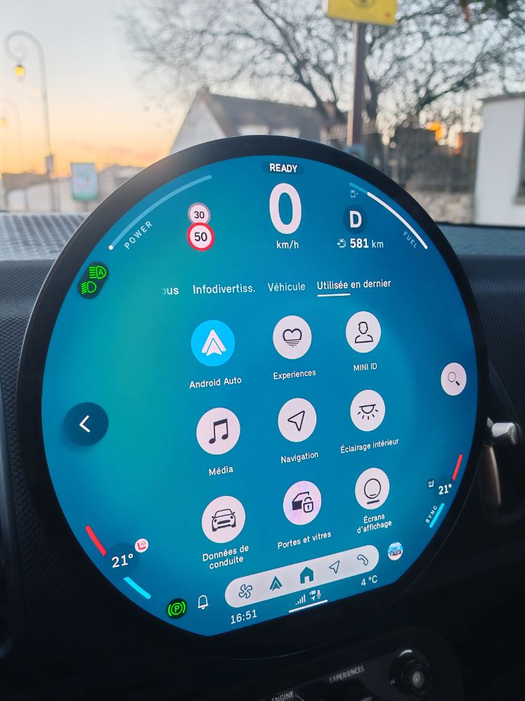 Il est possible de bénéficier d’un affichage tête haute bien que ce ne fut pas mon cas. Le tableau de bord et les contre-portes avec des matières recyclées m’apparaissent rêches au toucher mais bien assemblés, sans aucun bruit de mobilier. La sono Harman Kardon reste correcte et les Mini (jeu de mots) coupures avec Android Auto sans fil sont fréquentes, comme d’habitude.