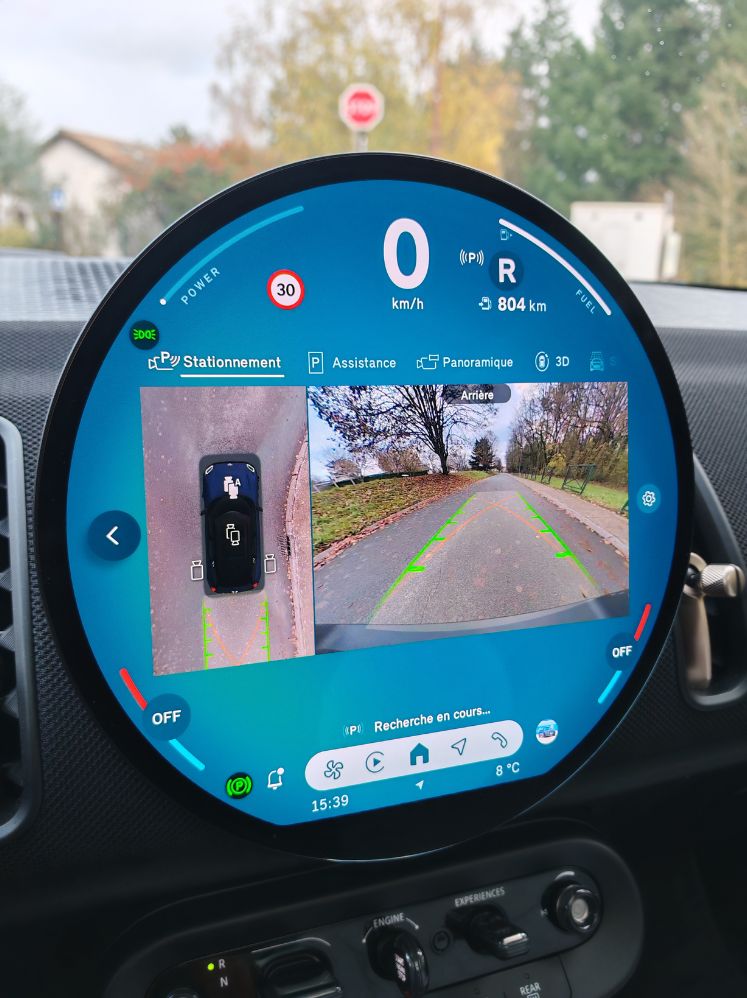 La jante du volant demeure toujours trop grande pour mes petites mains. On trouve toutefois un bouton mute ainsi qu’un chauffage tout comme pour les sièges. La majorité des actions passe par le grand écran central et rond de 24 cm de diamètre. Je commence à m’y habituer et je le trouve un peu moins lent. Ou alors, je suis plus indulgent. L’ergonomie n’est pas optimale mais on s’en sort pour la climatisation et on aura aussi quelques boutons physiques en guise de raccourcis comme celui sur le volant pour couper l’alerte de survitesse en le maintenant appuyé 2 secondes.