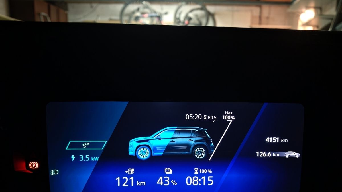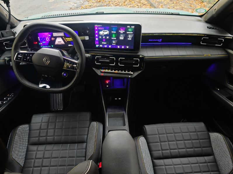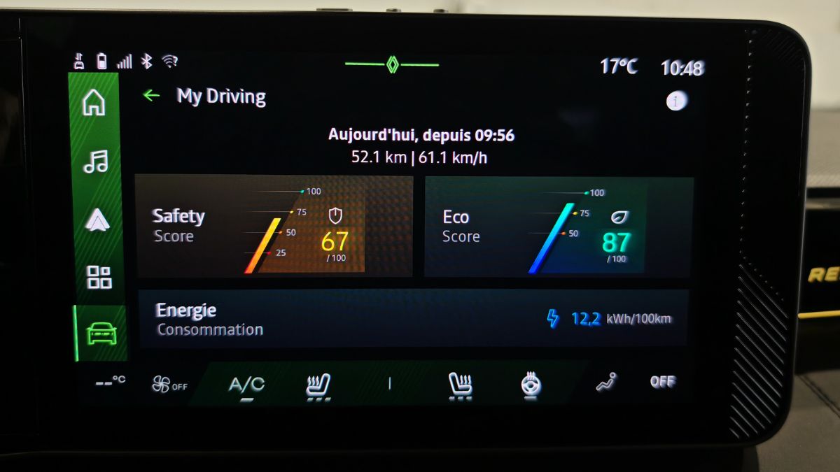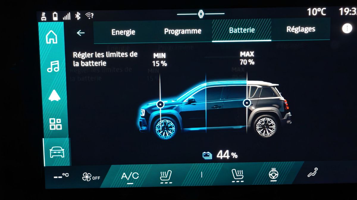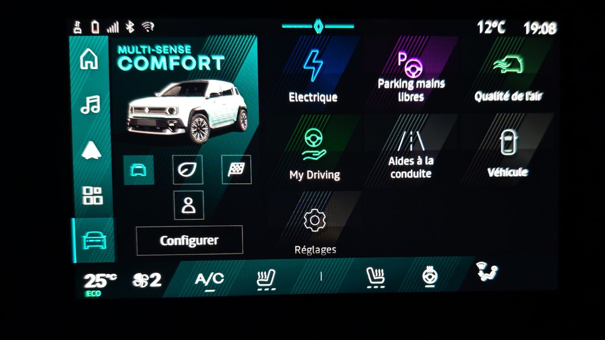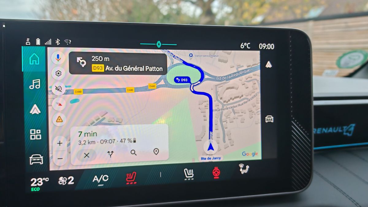Donc si on raisonne mathématiquement, les comptes ne sont pas bons. Si on a une prise renforcée chez soi (comme moi dorénavant !), on recharge tous les soirs et puis voilà. Même pas besoin d’une borne à domicile. À 3,5 kW, il faudra plus de 11h pour passer de 15 à 80 % mais on s’en fout car on dort la nuit. Il sera plus compliqué de se reposer en roulant sur les longs trajets à cause des bruits d’air dès 90 km/h. C’est une vilaine habitude chez Renault avec notamment l’Austral qui souffre des mêmes maux. Là encore, le silence d’une électrique en prend un coup avec aussi la ventilation bien trop forte en mode automatique.