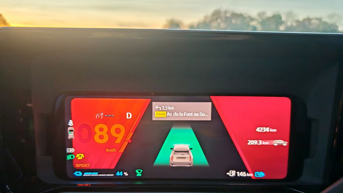 Comme je sortais d’une anémique Ypsilon de 110 ch et 205 Nm de couple pas immédiat du tout, j’ai mis l’écoconduite de côté avec ma R4 électrique. J’aime beaucoup trop tartiner (malgré les limites d’adhérence et de performance) que j’ai cramé de nombreux électrons lors des premiers jours. Le mode Sport offre toute la puissance possible mais j’ai préféré paramétrer le mode Perso pour garder une direction souple et apporter de la réactivité sur la pédale de droite. Un bouton bien pratique sur le volant permet les changements de modes de conduite. Le régulateur adaptatif s’adapte correctement.