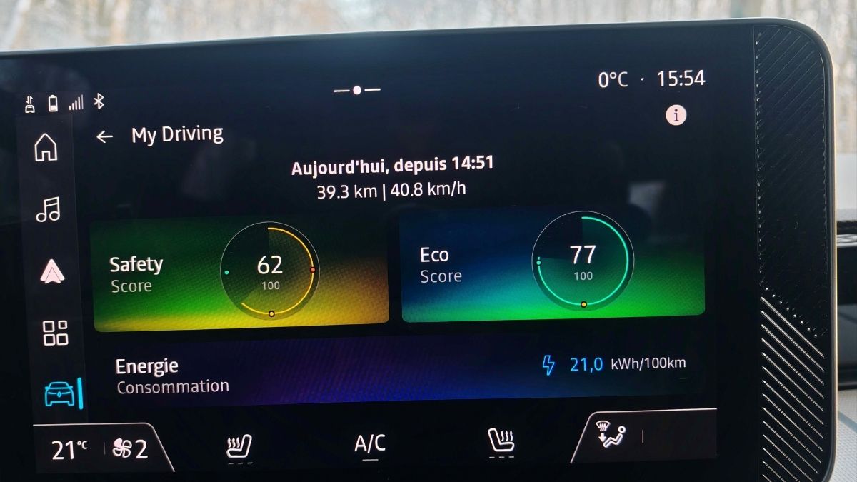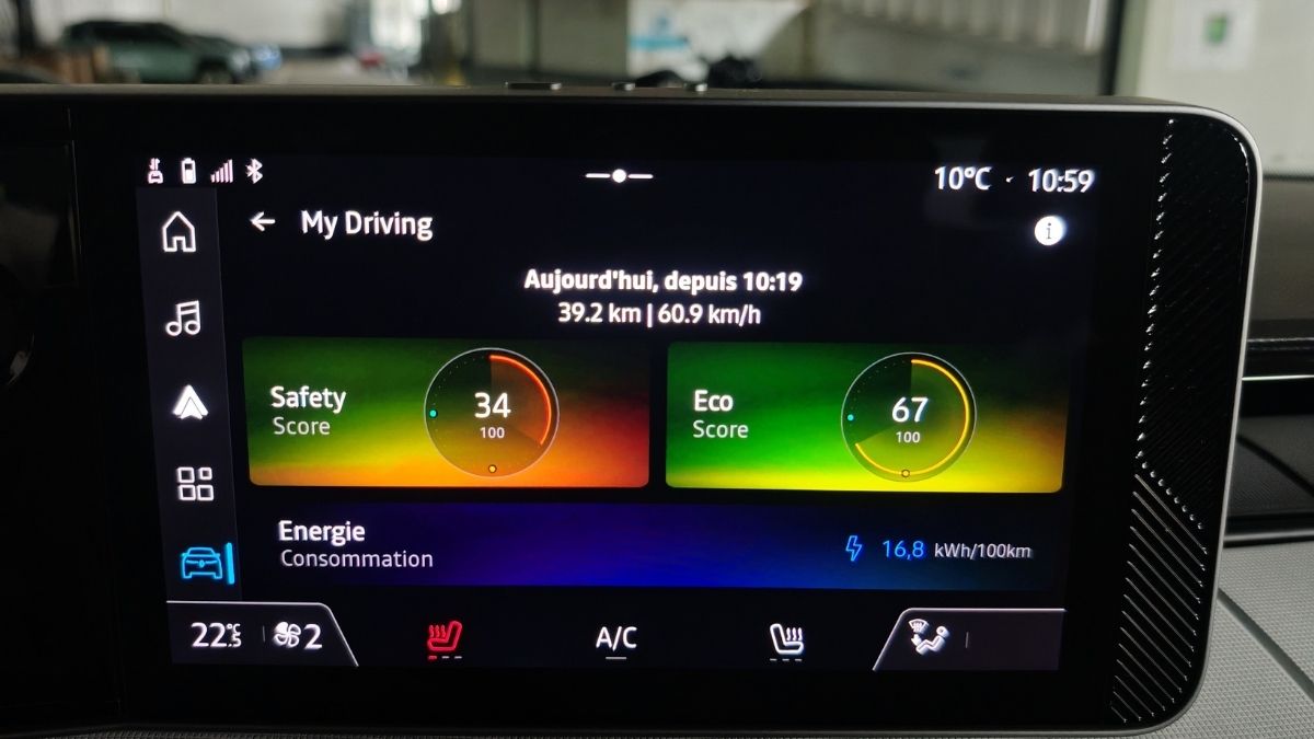 Renault doit absolument corriger les consommations pour offrir un minimum de polyvalence. Certes, on ne roule pas 170 km dans une journée mais on ne peut pas faire des arrêts de 30 min toutes les heures sur autoroute. La puissance max de recharge reste à 100 kW. Par contre, à son domicile, avec une prise renforcée et un câble 3,7 kW, on passe de 20 à 80 % en 10h30 donc une nuit suffit pour récupérer 100 km d’autonomie.