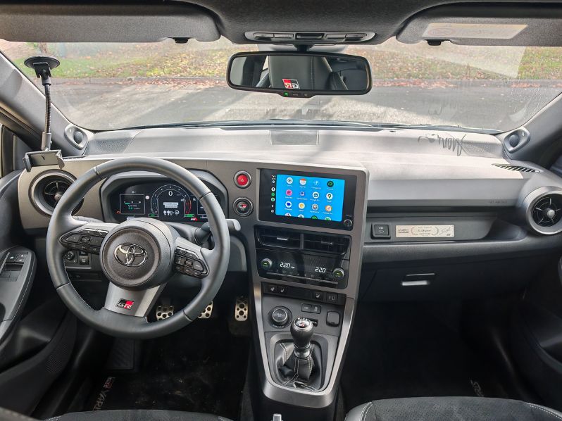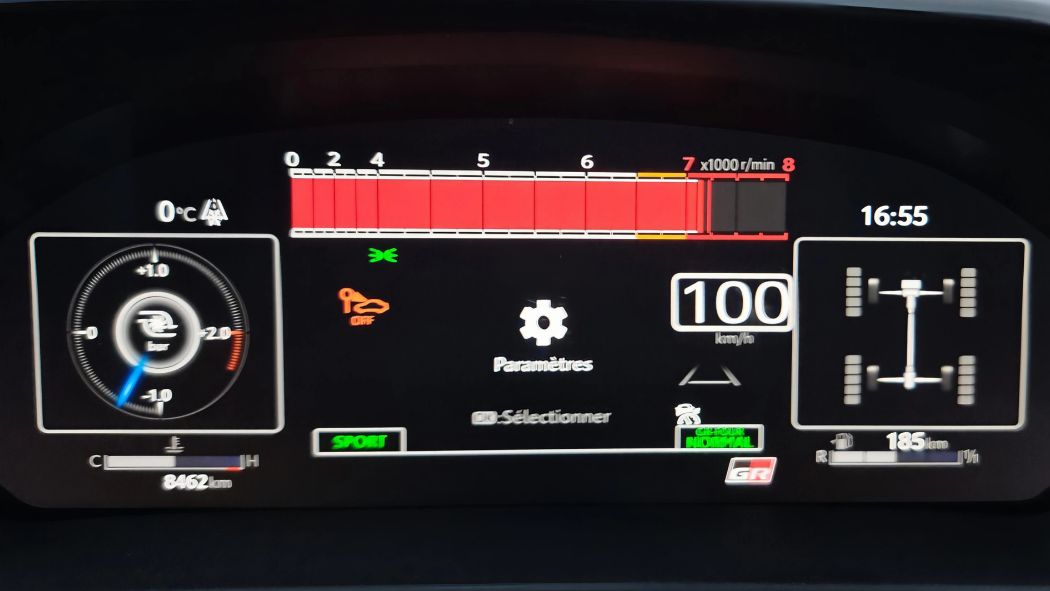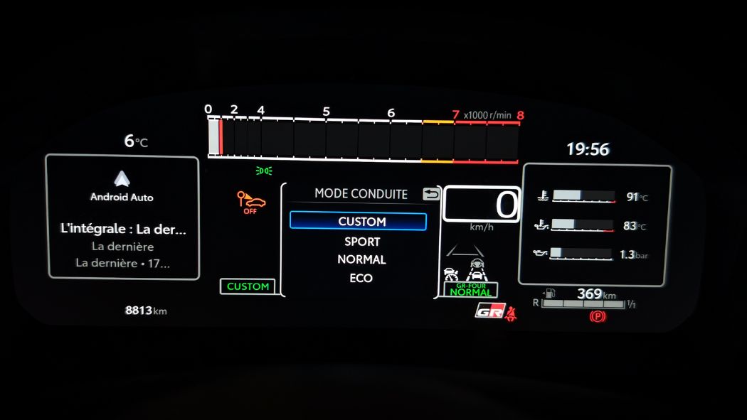 Avec une caisse de rallye, seules des routes fermées offrent un aperçu du potentiel. Plutôt qu’un circuit, il faut projeter cette GR Yaris dans des cols ou des spéciales nordiques. Entre asphalte et terre ou même neige. Je n’ai jamais eu autant de grip de toute ma vie, soit depuis 4 ans et une trentaine de sportives. Absolument hallucinant le combo motricité/Michelin Pilot Sport 4S. Pour la transmission, en normal, ça donne une répartition de 60 % à l’avant et 40 % à l’arrière. Attention à ne pas confondre le mode normal avec le mode normal. Car on a aussi un mode éco, normal, sport et custom. Très classiques qui changent la réponse à l’accélération, la dureté de la direction et la puissance de la climatisation.