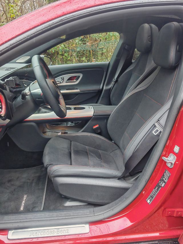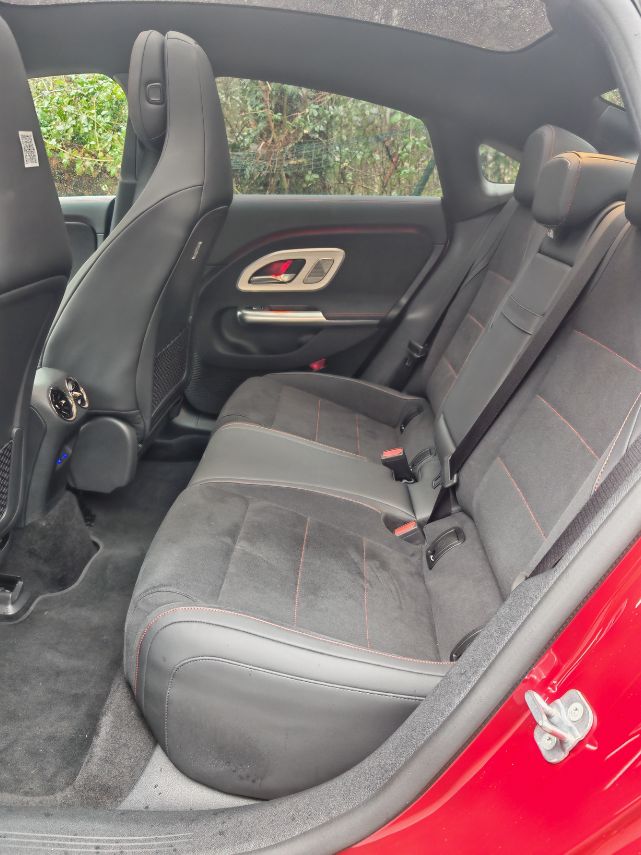 Ce que j’ai surtout adoré dans la CLA, ce sont les sièges sport (du pack AMG Line) pour leur confort, douceur et beauté. Malgré une position plus haute qu’attendue, ils participent grandement à l’agrément en étant aussi enveloppants (et chauffants contrairement au volant, petite pingrerie à ce montant). Les assises à l’arrière demeurent aussi plaisantes avec un espace plus limité au milieu et pour les têtes après 1,85 m. L’énorme (et joli) toit panoramique participe à la luminosité espérée.