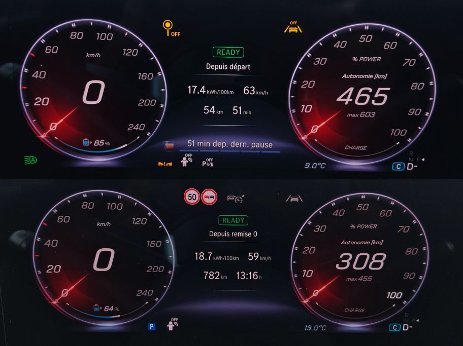 Les bruits d’air sur voies rapides sont majoritairement maîtrisés. Très vite, je comprends que ma consommation à 130 km/h (18,6 kWh/100 km) correspond peu ou prou à celle de mon quotidien (aux températures fraîches entre 5 et 14 °C) puisque ça donne 18,7 kWh/100 km en moyenne après 782 km. Avec une batterie de 85 kWh, nous obtenons 450 km réels. Un bon point vu mon usage souvent excessif engagé grâce au couple immédiat.