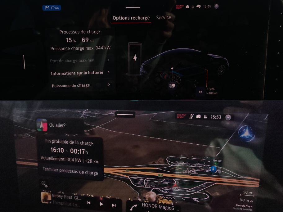 Le planificateur Mercedes bloque à 50 % l’état de la batterie à destination. C’est un premier mauvais point. Puis le GPS est trop lent et trop moche à mon goût. Cela me gêne donc de devoir passer par lui pour recharger dans les conditions optimales. Par contre, quand on le fait, on revient au pénultième chapitre : recharge nickel.