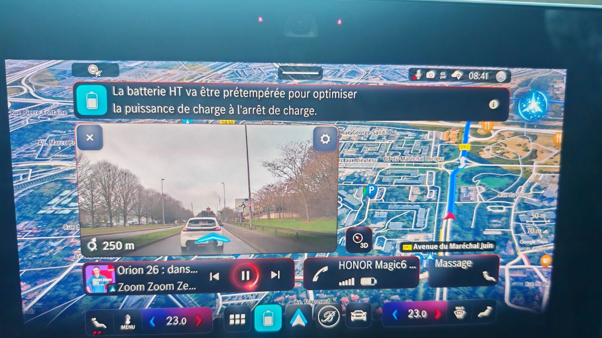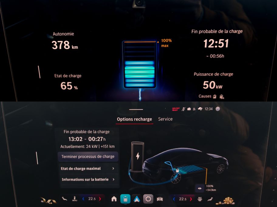 Moi je veux du 250 kW si la borne indique du 250 kW. Mais non, la vie ne se passe pas comme ça. Et pour préconditionner la batterie, on doit obligatoirement lancer le GPS natif afin qu’il calcule tout bien. Aucune possibilité de l’engager manuellement. Et moi, je n’aime pas les GPS natifs car je veux Google Maps. Puis c’est tout. Comme dans les Renault. Bon, mauvais exemple car aucune Renault ne dépasse les 150 kW.