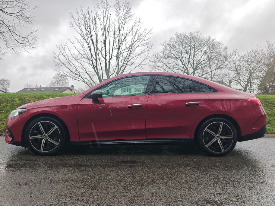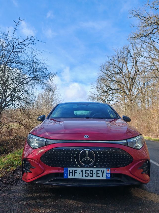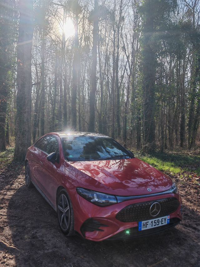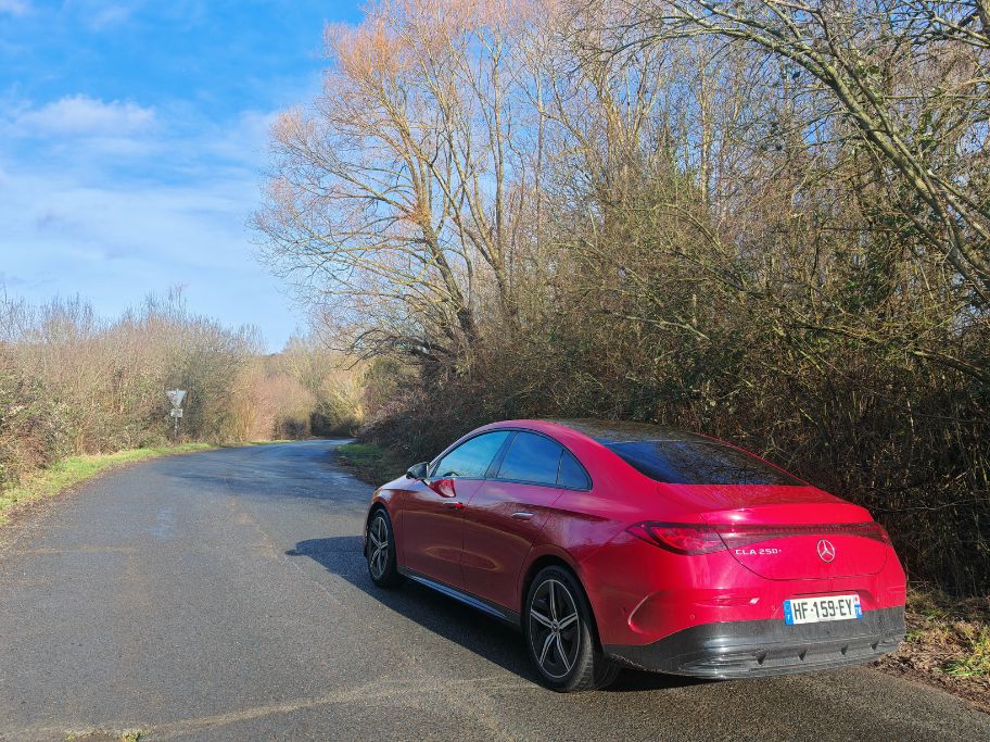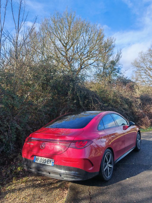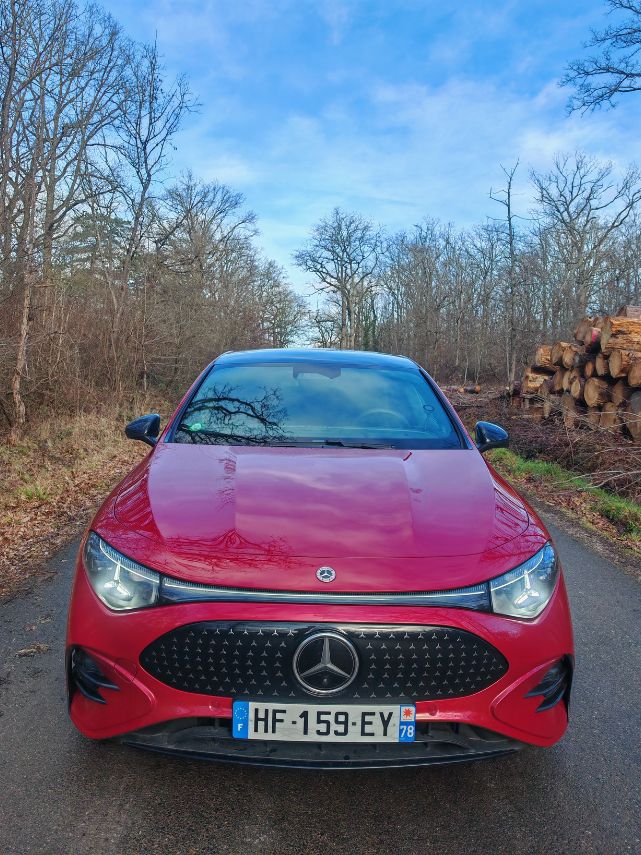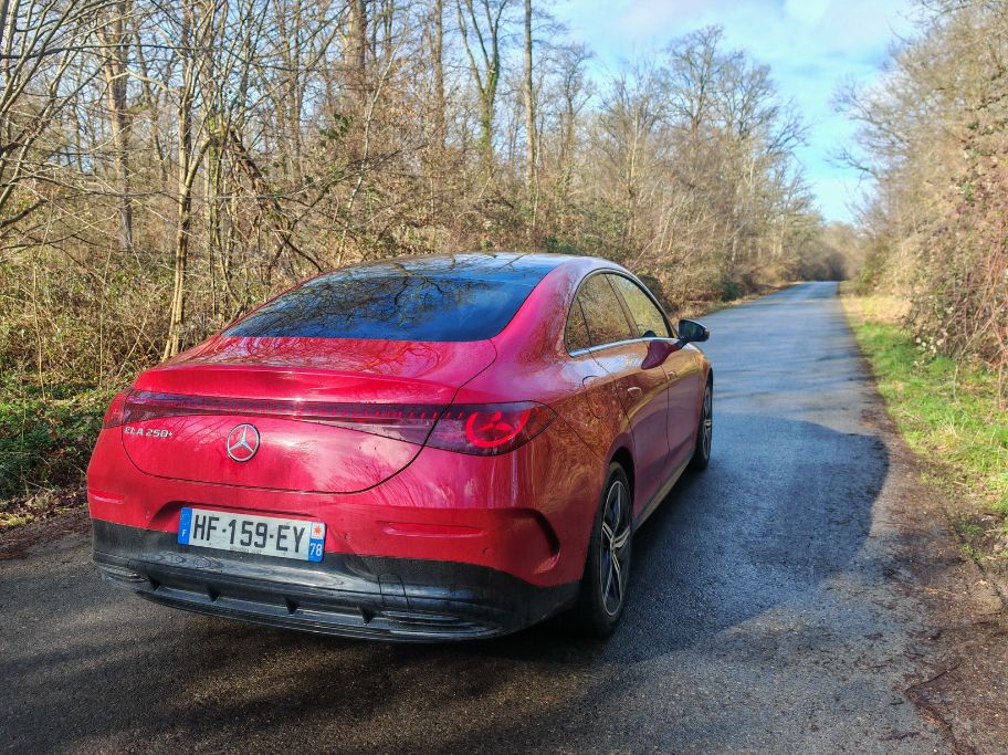 Pour les jantes pleines de 18 pouces, je suis moins enthousiaste mais ce Rouge Patagonie (comme celui de l’AMG A 45 S même s’il apparaît plus terne) en option à 300 € réhausse complètement la ligne. Les feux avant sont plus sympa que ceux à l’arrière. Je reste un peu dubitatif sur les grands bandeaux lumineux de part et d’autre. Mais bon, j’ai dit que je l’aimais bien donc je l’aime bien cette CLA de 3è génération.