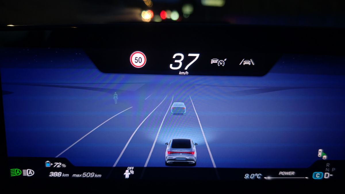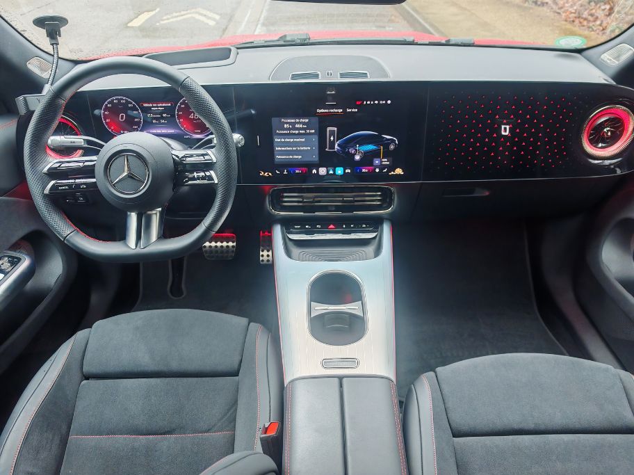 Plusieurs modes de récupération dont un One Pedal merveilleux. Un calibrage parfait jusqu’à l’arrêt. Peut-être encore meilleur que chez Tesla (sachant que chez Mercedes, on peut choisir aussi la roue libre) et cela participe énormément à la quiétude dans la circulation. La puissance de 272 ch correspond à tous les usages (légaux). On a une excellente fluidité dans la pédale d’accélération et le 0 à 100 km/h en 6,7 s permet de doubler et de s’insérer aisément. Le couple stagne à 335 Nm (contre 400 Nm pour la BMW i4 ou 440 Nm pour le Xpeng G6 de puissances similaires) et on pourrait en demander plus après 100 km/h. D’ailleurs, c’est plus ou moins à partir de cette allure que la CLA passe la seconde. Oui, pour une électrique, elle se dote d’une boîte à 2 vitesses. Cela permet de réduire la consommation.