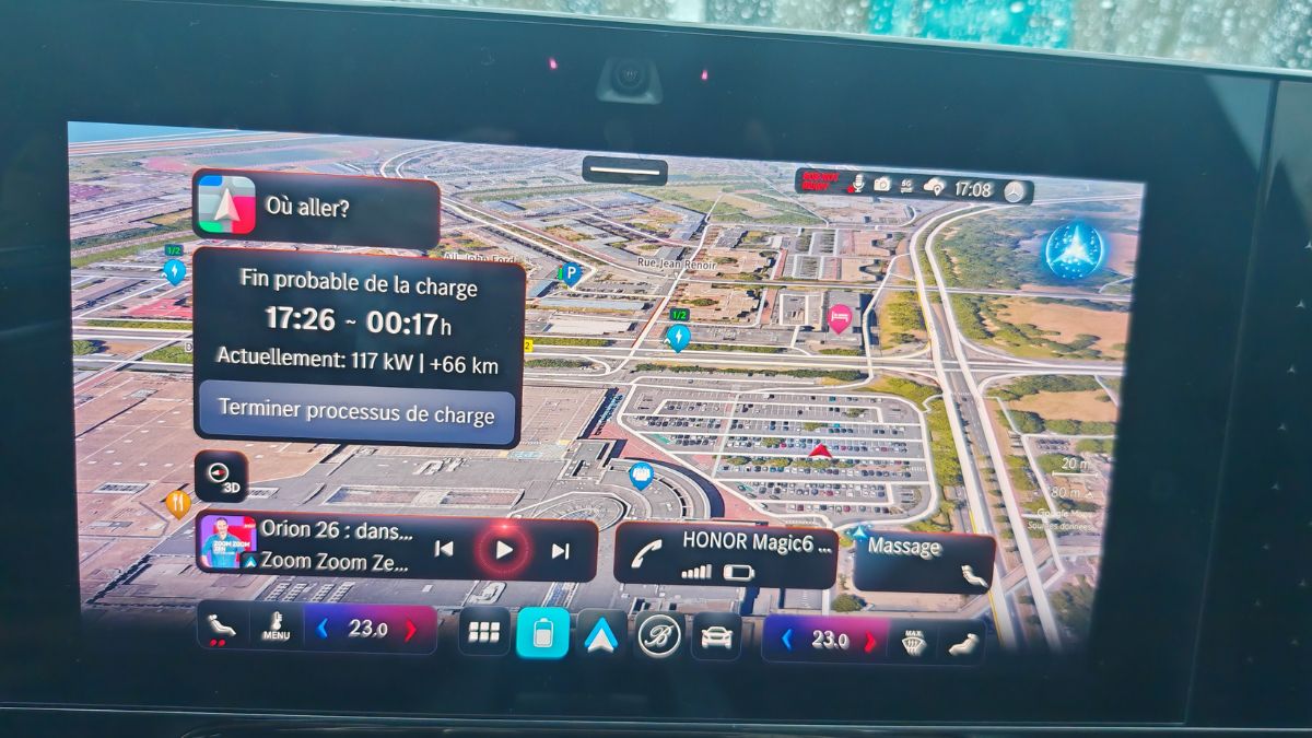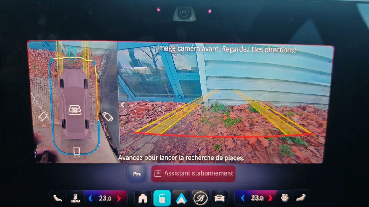 On aborde maintenant le prix de notre version EQ Limited Edition avec quelques packs d’options : 67 050 €. Donc vous pouvez hurler que c’est 20 000 € plus cher qu’une Model 3 Grande Autonomie Propulsion en Rouge Ultra, surtout quand celle-ci gagne le match chez Caradisiac. Comme toujours, Tesla reste imbattable sur le prix/performance/autonomie. Pourtant, Mercedes a de sérieux atouts avec sa vitesse de recharge (on y reviendra), son comportement routier (on y reviendra aussi), sa caméra 360 (avec un affichage parfois subjectif quant à la délimitation du véhicule et un Park Assist efficace) et CarPlay/Android Auto sans fil. Celui-ci coupe très très souvent.