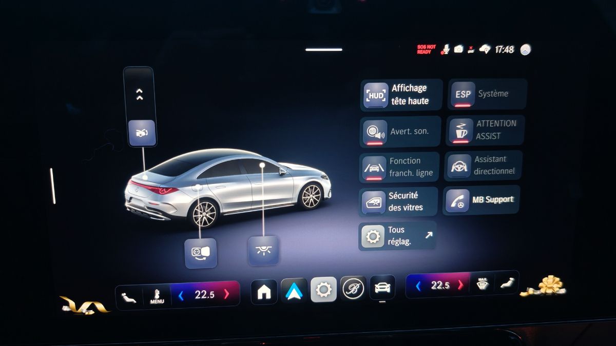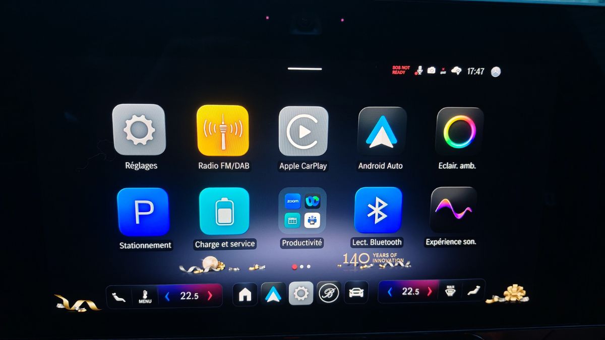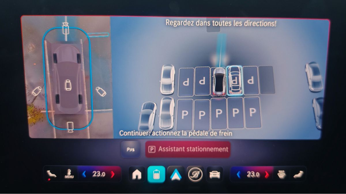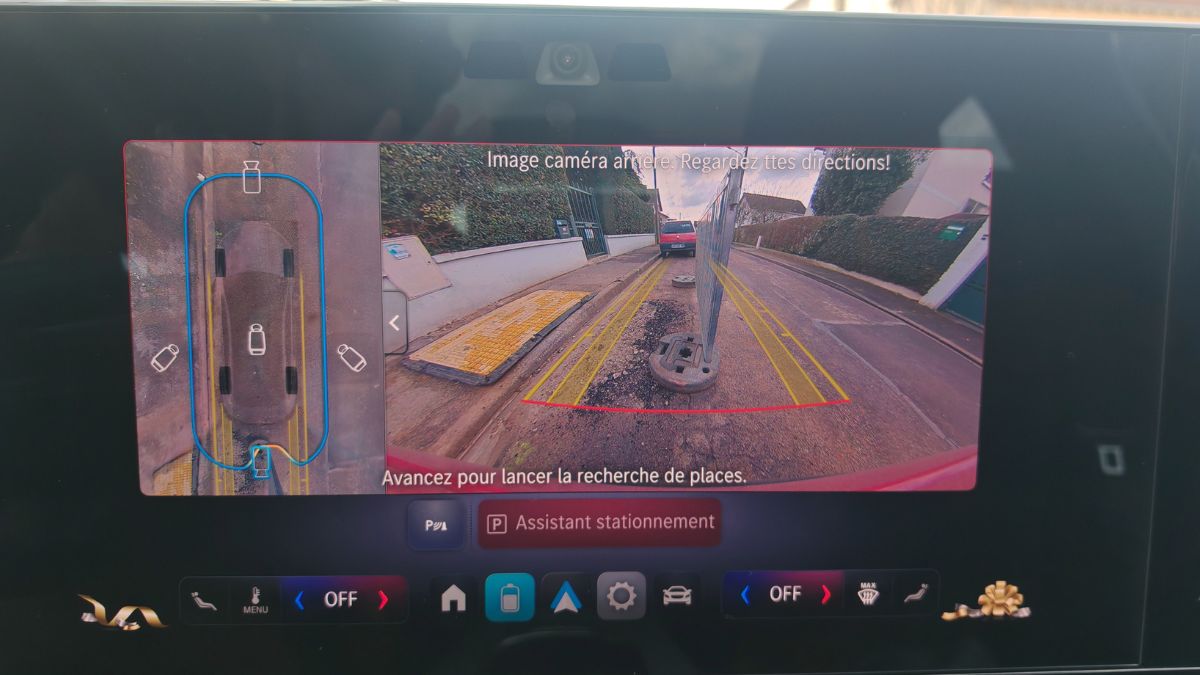Les icônes ressemblent à celles d’Apple, ce qui est un compliment à mes yeux. C’est aussi intuitif qu’auparavant avec les mêmes menus mais organisés un peu différemment. On s’y retrouve facilement d’autant plus que les items récemment activés viennent s’ajouter en page d’accueil. On clique une fois sur le panneau de vitesse pour couper l’alerte afférente. Cependant, on regrette l’accès aux réglages de la climatisation sans bouton physique. D’ailleurs, celle-ci a le mauvais goût d’émettre un léger sifflement ou un bourdonnement, au choix. On le remarque car autrement, le silence règne. On n’y fera plus trop attention avec la bonne sono Burmester.
