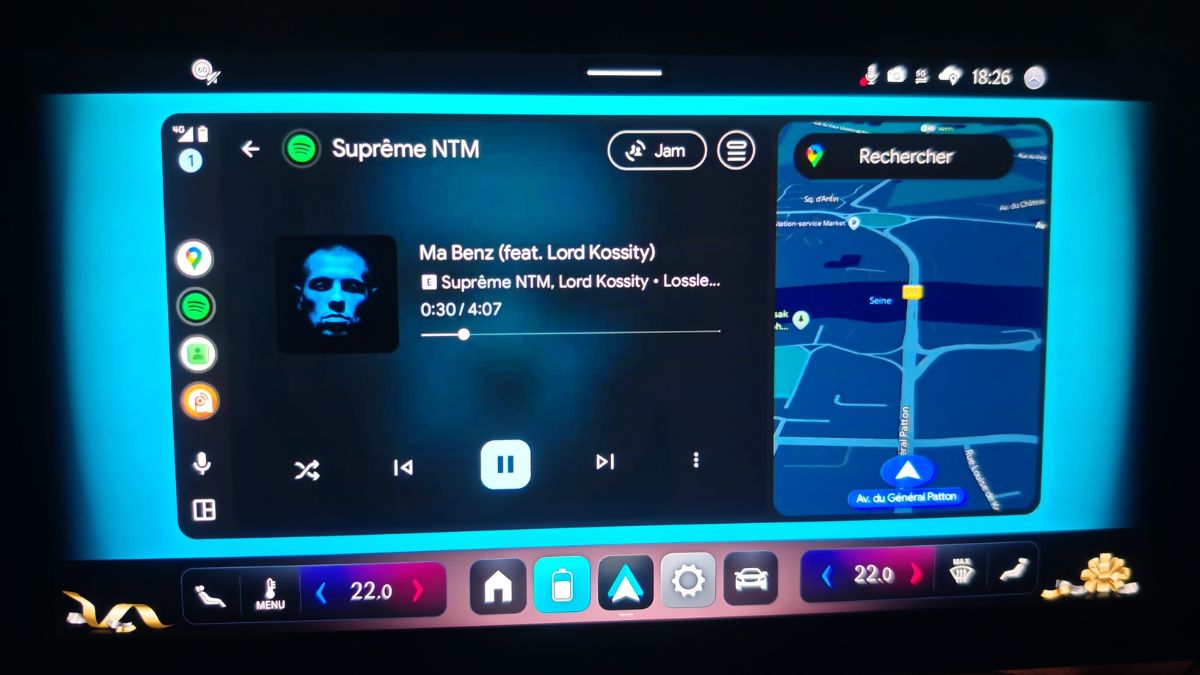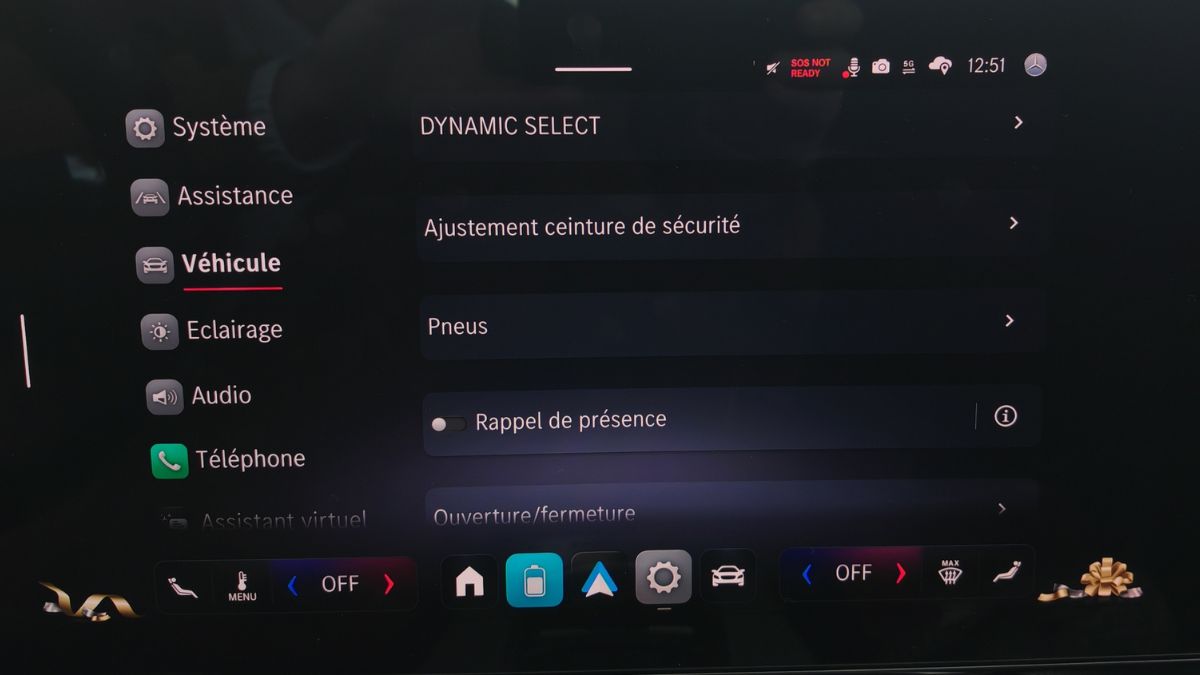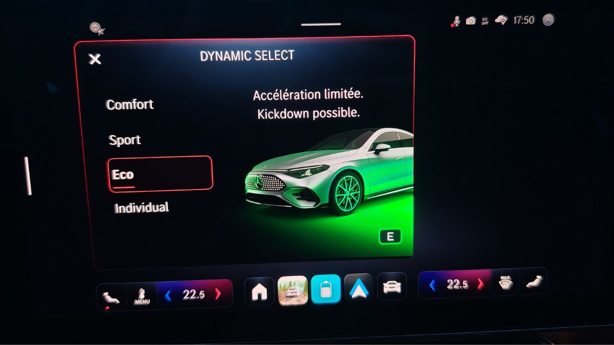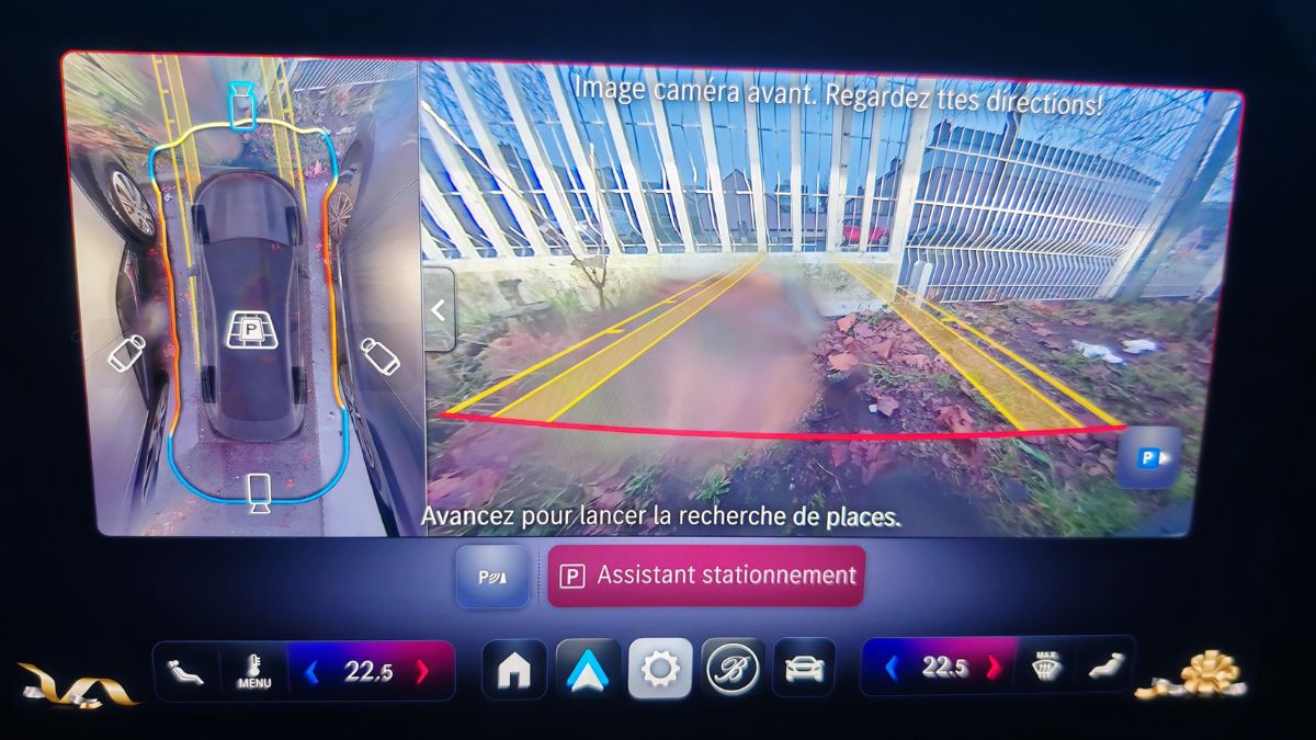 Les icônes ressemblent à celles d’Apple, ce qui est un compliment à mes yeux. C’est aussi intuitif qu’auparavant avec les mêmes menus mais organisés un peu différemment. On s’y retrouve facilement d’autant plus que les items récemment activés viennent s’ajouter en page d’accueil. On clique une fois sur le panneau de vitesse pour couper l’alerte afférente. Cependant, on regrette l’accès aux réglages de la climatisation sans bouton physique. D’ailleurs, celle-ci a le mauvais goût d’émettre un léger sifflement ou un bourdonnement, au choix. On le remarque car autrement, le silence règne. On n’y fera plus trop attention avec la bonne sono Burmester.