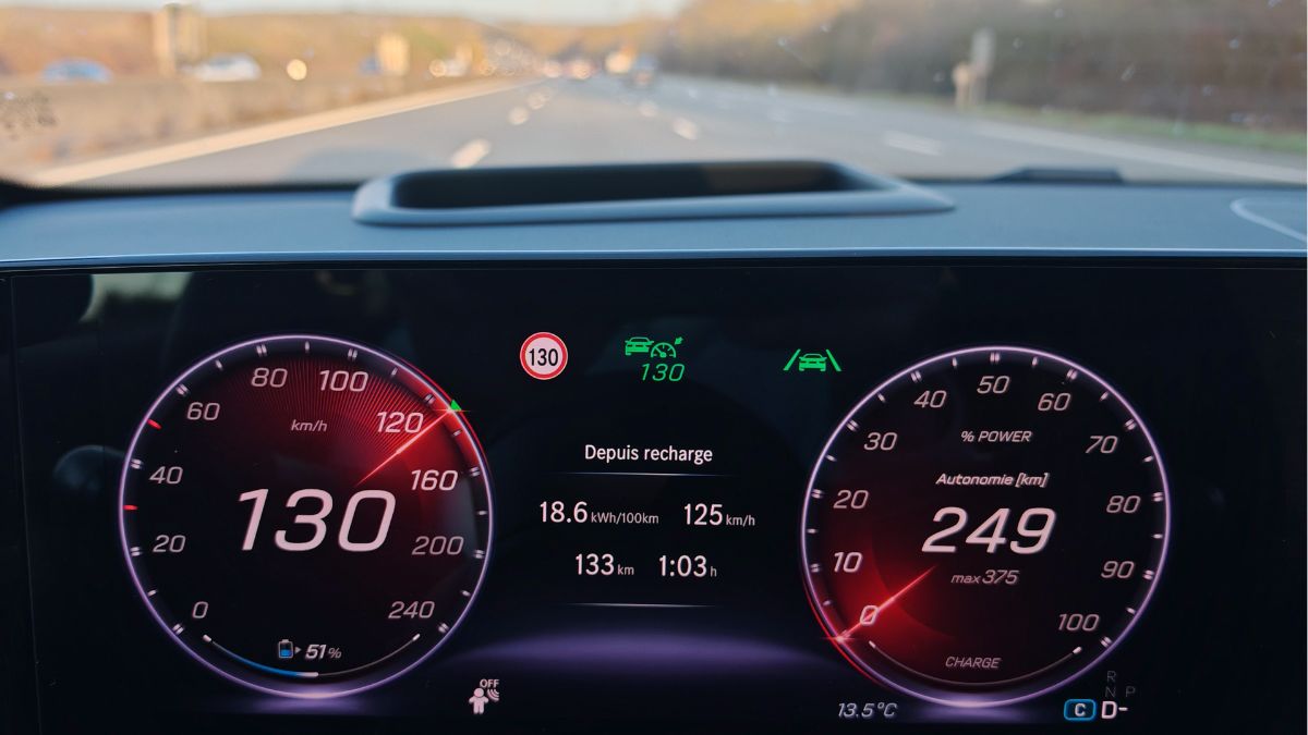 Sauf que là, j’ai une Ferrari qui roule à 320 km/h sur le papier et je dois faire un long trajet puis lui demander l’autorisation avant d’accéder à cette performance. Autrement, elle va se brider à des vitesses bien moindres. En l’espèce et à l’usage, l’ordinateur de bord indique la puissance max de recharge. Souvent à moins de 100 kW quand la batterie dépasse les 40 %. Donc qu’importe la puissance de la borne, en étant bloqué à 50 kW, la CLA prendra 27 min pour seulement récupérer 151 km et 20 min pour gagner 208 km avec une limite à 125 kW.
