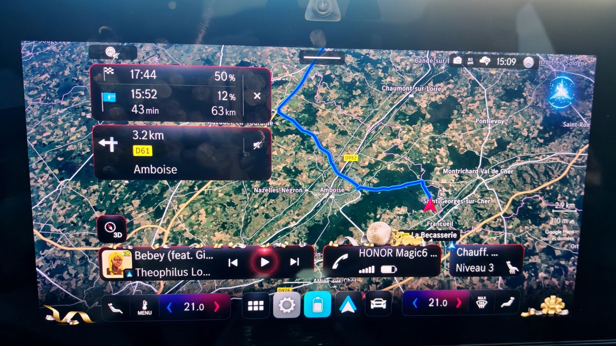 Avec une autonomie WLTP à 709 km et une recharge à 320 kW, j’étais dans l’obligation de le vérifier. Surtout quand Mercedes France file une carte (merci à eux !) pour payer aux bornes. Pour cela, je prends mon meilleur ami en passager et on se fait un aller-retour à Chenonceau dans la journée avec un bon resto à Blois.